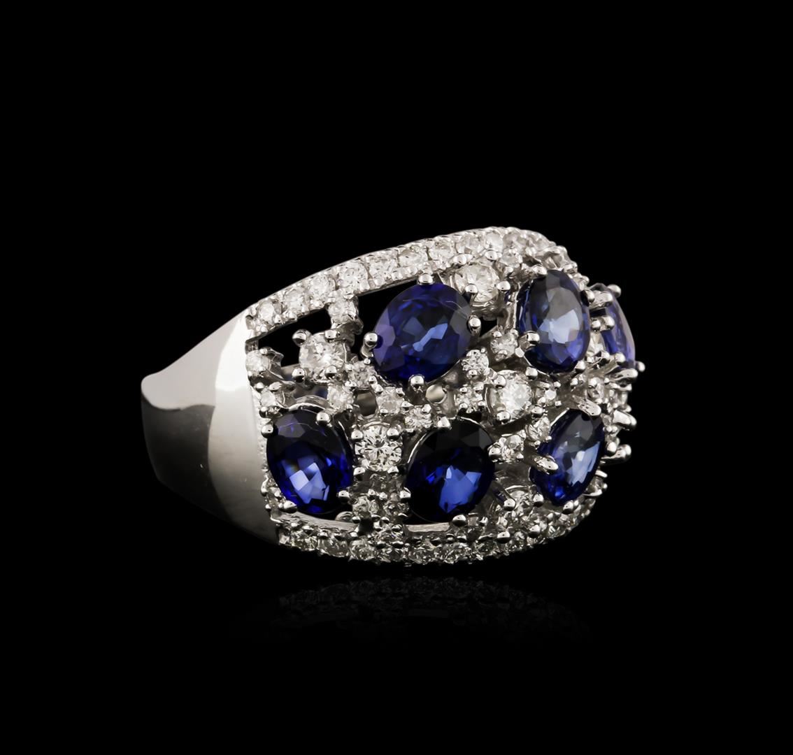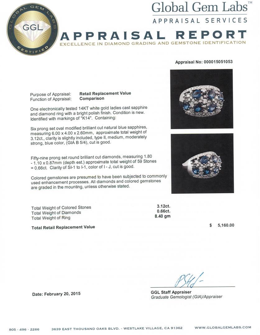 One electronically tested 14KT white gold ladies cast sapphire and diamond ring with a bright polish finish. Identified with markings of "K14". Condition is new. Containing: Six prong set oval modified brilliant cut natural blue sapphires, measuring 6.00 x 4.00 x 2.60mm, approximate total weight of 3.12ct., clarity is slightly included, type II, medium, moderately strong, blue color, (GIA B 5/4), cut is good. Fifty-Nine prong set round brilliant cut diamonds, measuring 1.80 - 1.10 x 0.87mm (depth est.) approximate total weight of 59 Stones = 0.66ct. Clarity: SI-1 to I-1. Color: I - J, Cut is Good. Colored gemstones are presumed to have been subjected to commonly used enhancement processes. All diamonds and colored gemstones are graded in the mounting, unless otherwise stated. Total Weight of Colored Stones 3.12ct. Total Weight of Diamonds 0.66ct. Total Weight of Ring 8.40 grams. GGL Appraised at $5,160.00.