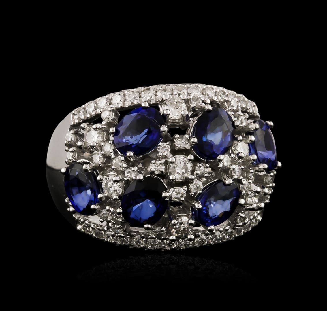 One electronically tested 14KT white gold ladies cast sapphire and diamond ring with a bright polish finish. Identified with markings of "K14". Condition is new. Containing: Six prong set oval modified brilliant cut natural blue sapphires, measuring 6.00 x 4.00 x 2.60mm, approximate total weight of 3.12ct., clarity is slightly included, type II, medium, moderately strong, blue color, (GIA B 5/4), cut is good. Fifty-Nine prong set round brilliant cut diamonds, measuring 1.80 - 1.10 x 0.87mm (depth est.) approximate total weight of 59 Stones = 0.66ct. Clarity: SI-1 to I-1. Color: I - J, Cut is Good. Colored gemstones are presumed to have been subjected to commonly used enhancement processes. All diamonds and colored gemstones are graded in the mounting, unless otherwise stated. Total Weight of Colored Stones 3.12ct. Total Weight of Diamonds 0.66ct. Total Weight of Ring 8.40 grams. GGL Appraised at $5,160.00.