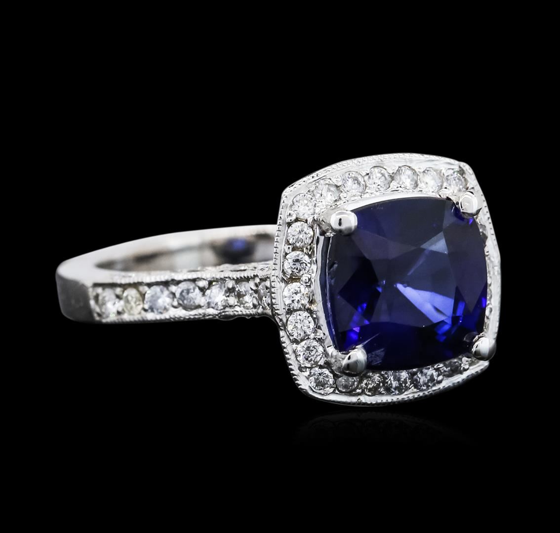 One electronically tested 14KT white gold ladies cast sapphire and diamond ring with a bright polish finish. Identified with markings of "14K". Condition is new. Containing: One prong set square cushion modified brilliant cut natural blue sapphire, measuring 8.00 x 8.00 x 5.20mm, approximate weight of 3.13ct., clarity is slightly included, type II, dark, moderately strong, blue color, (GIA B 7/4), cut is good. One Hundred Two prong set round brilliant cut diamonds, measuring 1.30 - 1.30 x 0.78mm (depth est.) approximate total weight of 102 Stones = 0.82ct. Clarity: SI-2 to I-1. Color: H - I, Cut is Good. Colored gemstones are presumed to have been subjected to commonly used enhancement processes. All diamonds and colored gemstones are graded in the mounting, unless otherwise stated. Total Weight of Colored Stones 3.13ct. Total Weight of Diamonds 0.82ct. Total Weight of Ring 5.10 grams. GGL Appraised at $5,810.00.
