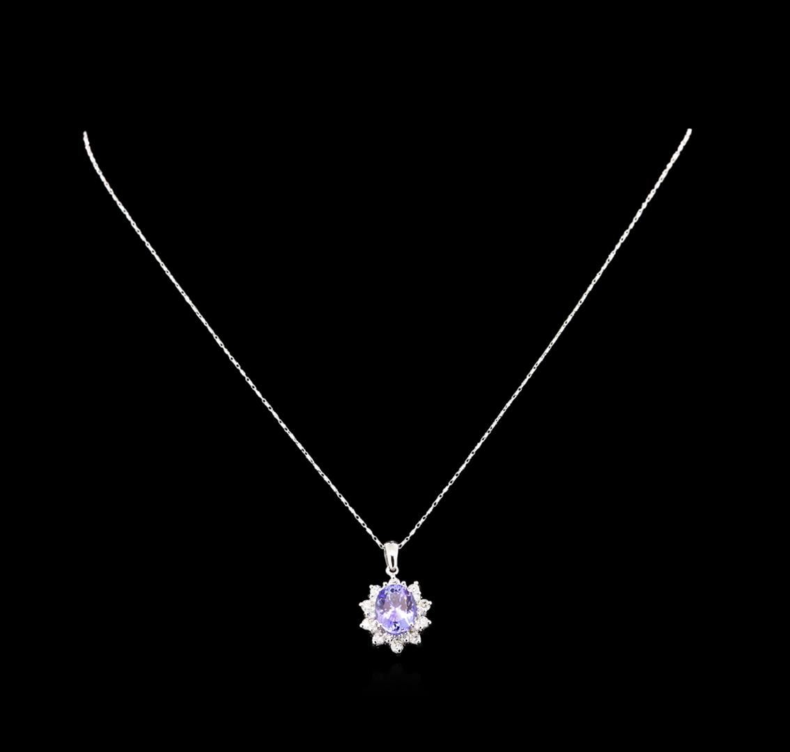 One electronically tested 14KT white gold ladies cast & assembled tanzanite and diamond pendant with chain. The pendant features a tanzanite set within a tiered diamond floret bezel, completed by a white gold bail. The pendant is supported by an eighteen inch length 14KT white gold designer style chain, terminating in a lobster claw clasp. Bright polish finish. Identified with markings of "14K". Condition is new, good workmanship. Containing: One prong set oval mixed cut natural tanzanite, measuring 10.25 x 8.26 x 5.16mm, 6% bulge factor, approximate weight of 3.14ct., clarity is eye clean, type I, medium, very slightly grayish, bluish violet color, (GIA bV 5/3), cut is good. Transmitting light with no distortion, transparent. Graded in the setting. Tanzanite is a very rare gemstone that is only found in the country of Tanzania. Originally discovered in 1967. Tiffany & Company, named the stone Tanzanite. It is found in the Usumburu Mountains that border the Umba Valley of northern Tanzania. Tanzanite occurs in gray, brown, violet, blue, reddish-purple, & green. The gem is interesting because of its exceptional pleochroism. Rotated in different directions a tanzanite will exhibit multiple changes of color. Tanzanite has a low tolerance to ultrasonic cleaning, and should not be cleaned using this method. Ten prong set round brilliant cut diamonds, measuring 2.40 - 2.30 x 1.41mm (depth est.) approximate total weight of 10 Stones = 0.50ct. Graded in the setting. Clarity: VS-1 to SI-1. Color: G - I Ten prong set round brilliant cut diamonds, measuring 1.40 - 1.30 x 0.81mm (depth est.) approximate total weight of 10 Stones = 0.15ct. Graded in the setting. Clarity: VS-1 to SI-1. Color: G - I. Total Weight of Colored Stones 3.14ct. Total Weight of Diamonds 0.65ct. Total Weight of Pendant With Chain 6.68 grams. AIG Appraised at $9,775.00.