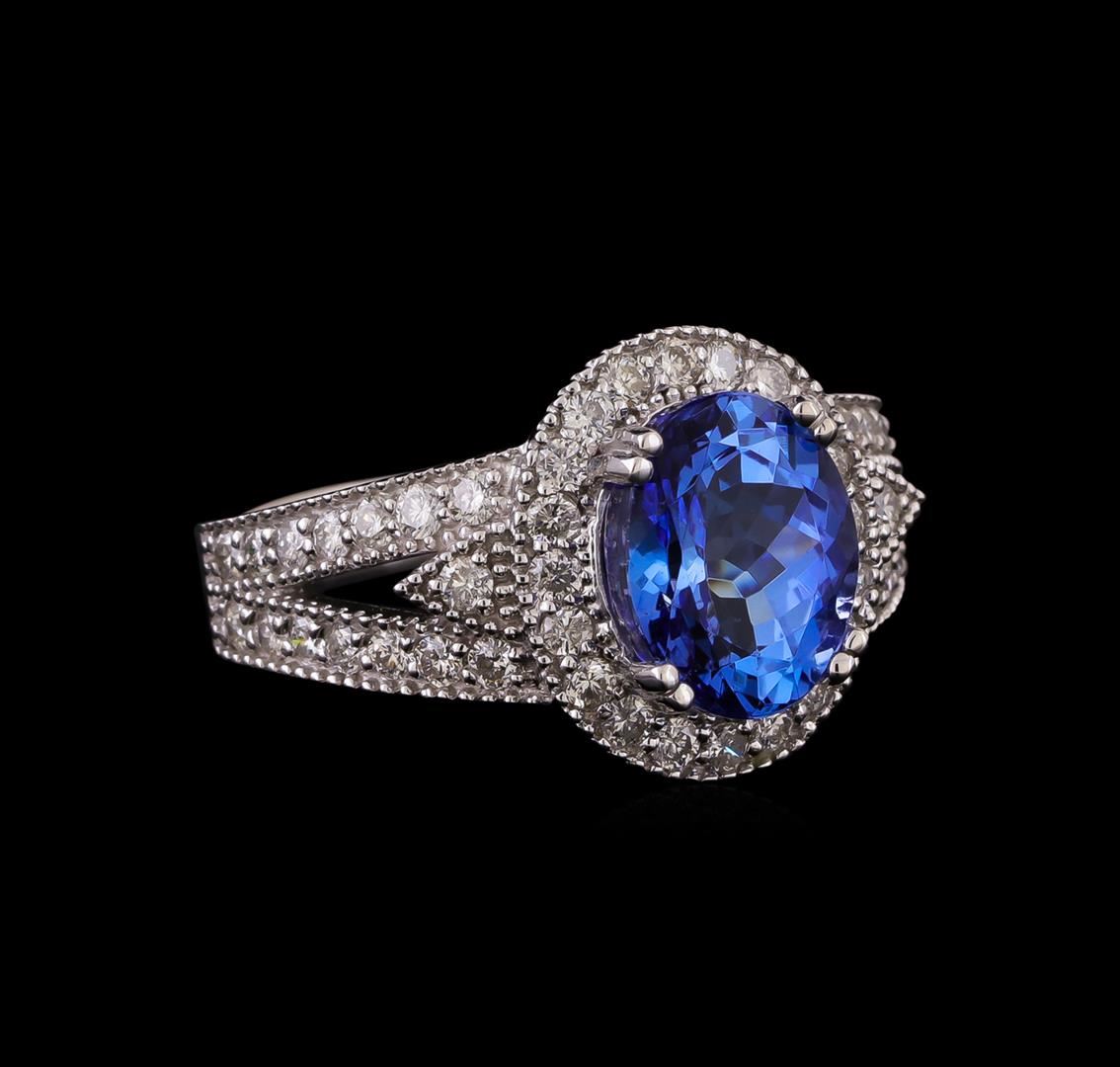 One electronically tested 14KT white gold ladies cast tanzanite and diamond ring with a bright polish finish. Identified with markings of "K14". Condition is new. Containing: One prong set oval modified brilliant cut natural tanzanite, measuring 10.20 x 8.20 x 5.33mm, approximate weight of 3.14ct., clarity is eye clean, type I, medium, very slightly grayish, violet color, (GIA V 5/3), cut is good. Fifty prong set round brilliant cut diamonds, measuring 1.50 - 1.50 x 0.90mm (depth est.) approximate total weight of 50 Stones = 0.62ct. Clarity: SI-1 to I-1. Color: H - I, Cut is Good. Colored gemstones are presumed to have been subjected to commonly used enhancement processes. All diamonds and colored gemstones are graded in the mounting, unless otherwise stated. Total Weight of Colored Stones 3.14ct. Total Weight of Diamonds 0.62ct. Total Weight of Ring 7.20 grams. GGL Appraised at $5,640.00.