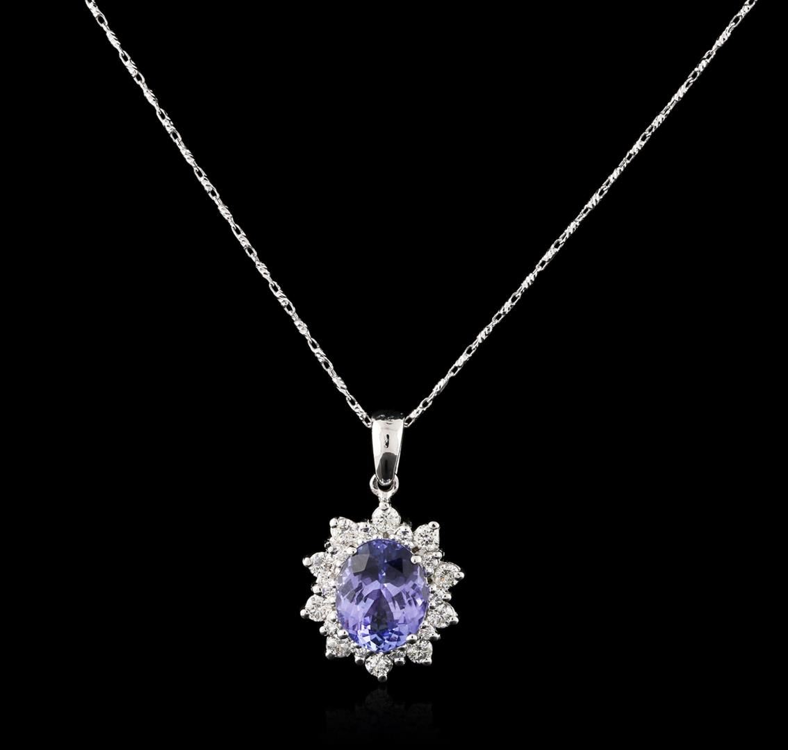 One electronically tested 14KT white gold ladies cast & assembled tanzanite and diamond pendant with chain. The pendant features a tanzanite set within a tiered diamond floret bezel, completed by a white gold bail. The pendant is supported by an eighteen inch length 14KT white gold designer style chain, terminating in a lobster claw clasp. Bright polish finish. Identified with markings of "14K". Condition is new, good workmanship. Containing: One prong set oval mixed cut natural tanzanite, measuring 10.25 x 8.26 x 5.16mm, 6% bulge factor, approximate weight of 3.14ct., clarity is eye clean, type I, medium, very slightly grayish, bluish violet color, (GIA bV 5/3), cut is good. Transmitting light with no distortion, transparent. Graded in the setting. Tanzanite is a very rare gemstone that is only found in the country of Tanzania. Originally discovered in 1967. Tiffany & Company, named the stone Tanzanite. It is found in the Usumburu Mountains that border the Umba Valley of northern Tanzania. Tanzanite occurs in gray, brown, violet, blue, reddish-purple, & green. The gem is interesting because of its exceptional pleochroism. Rotated in different directions a tanzanite will exhibit multiple changes of color. Tanzanite has a low tolerance to ultrasonic cleaning, and should not be cleaned using this method. Ten prong set round brilliant cut diamonds, measuring 2.40 - 2.30 x 1.41mm (depth est.) approximate total weight of 10 Stones = 0.50ct. Graded in the setting. Clarity: VS-1 to SI-1. Color: G - I Ten prong set round brilliant cut diamonds, measuring 1.40 - 1.30 x 0.81mm (depth est.) approximate total weight of 10 Stones = 0.15ct. Graded in the setting. Clarity: VS-1 to SI-1. Color: G - I. Total Weight of Colored Stones 3.14ct. Total Weight of Diamonds 0.65ct. Total Weight of Pendant With Chain 6.68 grams. AIG Appraised at $9,775.00.
