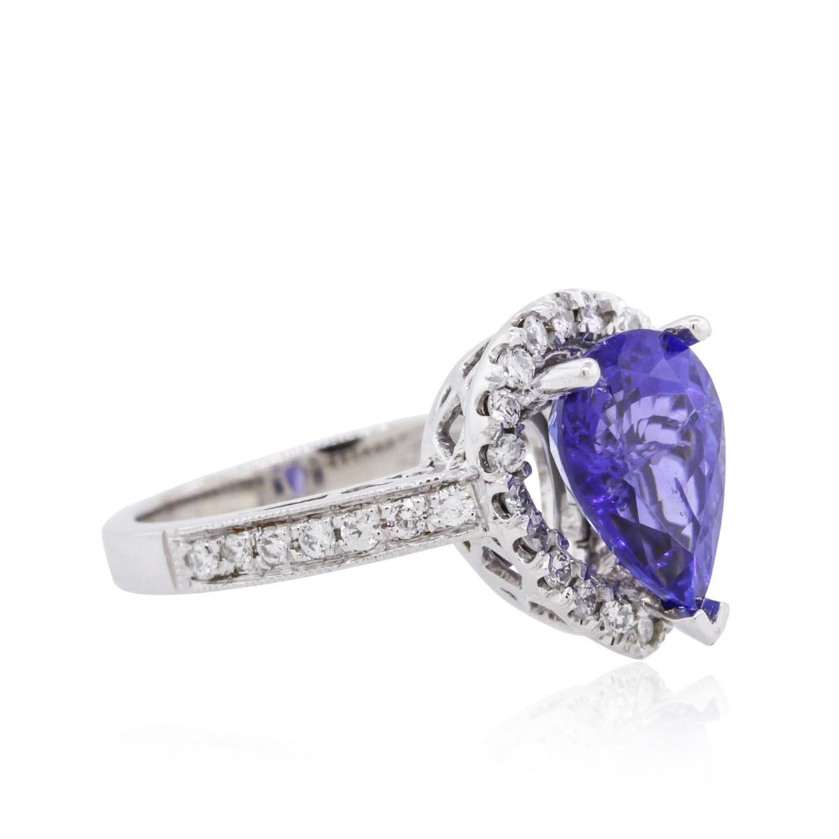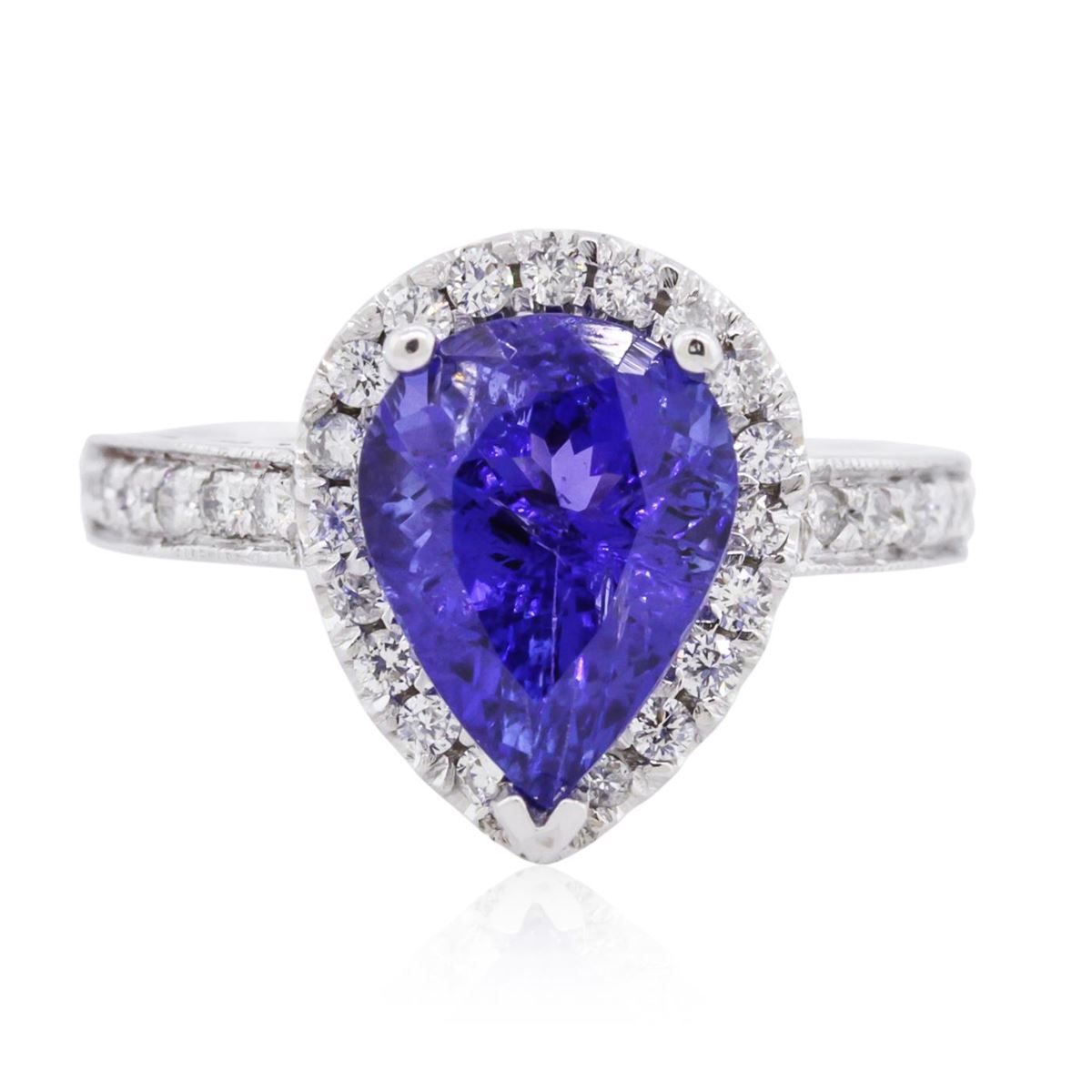 One electronically tested 14KT white gold ladies combination cast & assembled tanzanite and diamond ring with a flat shank with a bright polish finish. Identified with markings of 14K. Condition is new. Containing: One prong set pear modified brilliant cut natural tanzanite, measuring 10.47 x 8.18 x 5.48mm, approximate weight of 3.14ct., clarity is eye clean, type I, medium, moderately strong, violet color, (GIA V 5/4), cut is good. Thirty-Four prong set round brilliant cut diamonds, measuring 1.30 - 1.30 x 0.78mm (depth est.) approximate total weight of 34 Stones = 0.27ct. Clarity: SI-2 to I-1. Color: H - I, Cut is Good. Colored gemstones are presumed to have been subjected to commonly used enhancement processes. All diamonds and colored gemstones are graded in the mounting, unless otherwise stated. Total Weight of Colored Stones 3.14ct. Total Weight of Diamonds 0.27ct. Total Weight of Ring 4.90 grams. GGL Appraised at $5,635.00.
