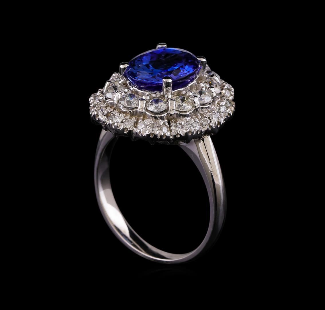 One electronically tested 14KT white gold ladies combination cast & assembled tanzanite and diamond ring with a flat shank with a bright polish finish. Identified with markings of "K14". Condition is new. Containing: One prong set oval modified brilliant cut natural tanzanite, measuring 10.24 x 8.33 x 5.46mm, approximate weight of 3.15ct., clarity is eye clean, type I, medium light, moderately strong, violet color, (GIA V 4/4), cut is good. Twelve prong set round brilliant cut diamonds, measuring 2.50 - 2.50 x 1.50mm (depth est.) approximate total weight of 12 Stones = 0.69ct. Clarity: SI-2 to I-1. Color: I - J, Cut is Good. Thirty-Six prong set round brilliant cut diamonds, measuring 1.00 - 1.00 x 0.60mm (depth est.) approximate total weight of 36 Stones = 0.13ct. Clarity: I-1. Color: H - I, Cut is Good. Colored gemstones are presumed to have been subjected to commonly used enhancement processes. All diamonds and colored gemstones are graded in the mounting, unless otherwise stated. Total Weight of Colored Stones 3.15ct. Total Weight of Diamonds 0.82ct. Total Weight of Ring 8.10 grams. GGL Appraised.