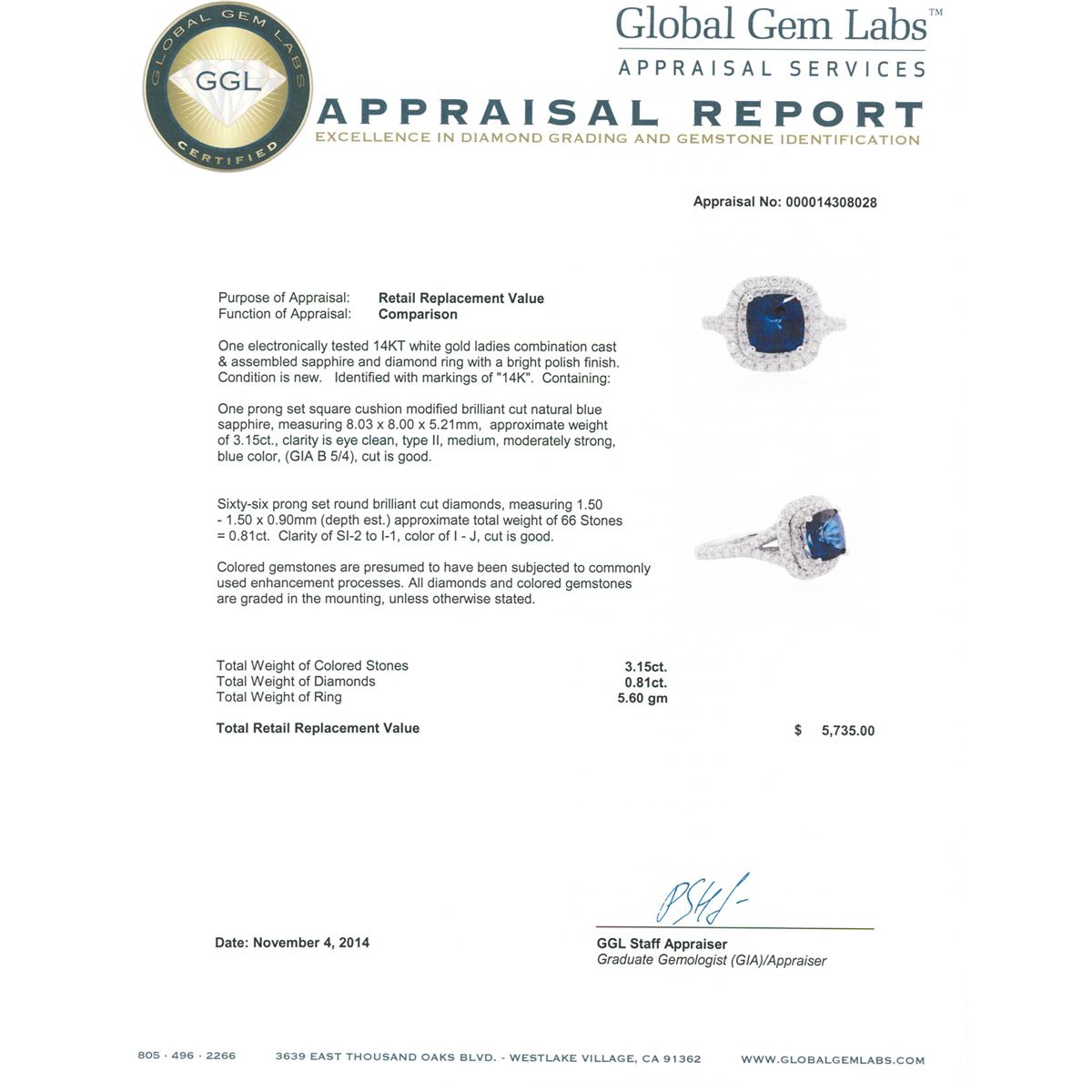 One electronically tested 14KT white gold ladies combination cast & assembled sapphire and diamond ring with a bright polish finish. Identified with markings of "14K". Condition is new. Containing: One prong set square cushion modified brilliant cut natural blue sapphire, measuring 8.03 x 8.00 x 5.21mm, approximate weight of 3.15ct., clarity is eye clean, type II, medium, moderately strong, blue color, (GIA B 5/4), cut is good. Sixty-Six prong set round brilliant cut diamonds, measuring 1.50 - 1.50 x 0.90mm (depth est.) approximate total weight of 66 Stones = 0.81ct. Clarity: SI-2 to I-1. Color: I - J, Cut is Good. Colored gemstones are presumed to have been subjected to commonly used enhancement processes. All diamonds and colored gemstones are graded in the mounting, unless otherwise stated. Total Weight of Colored Stones 3.15ct. Total Weight of Diamonds 0.81ct. Total Weight of Ring 5.60 grams. GGL Appraised at $5,735.00.