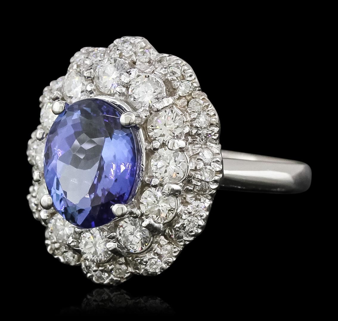 One electronically tested 14KT white gold ladies combination cast & assembled tanzanite and diamond ring with a flat shank with a bright polish finish. Identified with markings of "K14". Condition is new. Containing: One prong set oval modified brilliant cut natural tanzanite, measuring 10.24 x 8.33 x 5.46mm, approximate weight of 3.15ct., clarity is eye clean, type I, medium light, moderately strong, violet color, (GIA V 4/4), cut is good. Twelve prong set round brilliant cut diamonds, measuring 2.50 - 2.50 x 1.50mm (depth est.) approximate total weight of 12 Stones = 0.69ct. Clarity: SI-2 to I-1. Color: I - J, Cut is Good. Thirty-Six prong set round brilliant cut diamonds, measuring 1.00 - 1.00 x 0.60mm (depth est.) approximate total weight of 36 Stones = 0.13ct. Clarity: I-1. Color: H - I, Cut is Good. Colored gemstones are presumed to have been subjected to commonly used enhancement processes. All diamonds and colored gemstones are graded in the mounting, unless otherwise stated. Total Weight of Colored Stones 3.15ct. Total Weight of Diamonds 0.82ct. Total Weight of Ring 8.10 grams. GGL Appraised at $8,905.00.