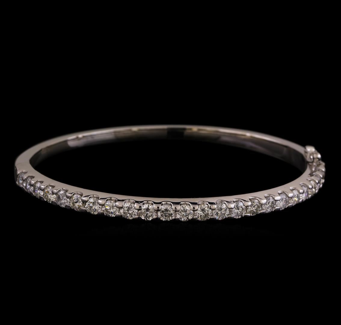 One electronically tested 14KT white gold ladies cast diamond bangle bracelet with a hidden box clasp with safety closer with a bright polish finish. Identified with markings of "K14". Condition is new. Containing: Twenty-Four prong set round brilliant cut diamonds, measuring 3.30 - 3.30 x 1.98mm (depth est.) approximate total weight of 24 Stones = 3.16ct. Clarity: I-1. Color: I - J, Cut is Good. All diamonds are graded in the mounting, unless otherwise stated. Total Weight of Diamonds 3.16ct. Total Weight of Bangle Bracelet 15.00 grams. GGL Appraised at $9,085.00.