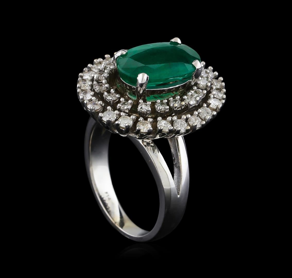 One electronically tested 14KT white gold ladies combination cast & assembled ring with a bright polish finish. Identified with markings of "K14". Condition is new. Containing: One prong set oval modified brilliant cut natural emerald, measuring 13.32 x 8.50 x 4.88mm, approximate weight of 3.16ct., clarity is heavily included, type III, medium, moderately strong, green color, (GIA G 5/4), cut is good. Forty prong set round brilliant cut diamonds, measuring 1.90 - 1.50 x 1.02mm (depth est.) approximate total weight of 40 Stones = 0.72ct. Clarity: I-1 to I-2. Color: I - J, Cut is Good. Colored gemstones are presumed to have been subjected to commonly used enhancement processes. All diamonds and colored gemstones are graded in the mounting, unless otherwise stated. Total Weight of Colored Stones 3.16ct. Total Weight of Diamonds 0.72ct. Total Weight of Ring 12.40 grams. GGL Appraised at $12,125.00.
