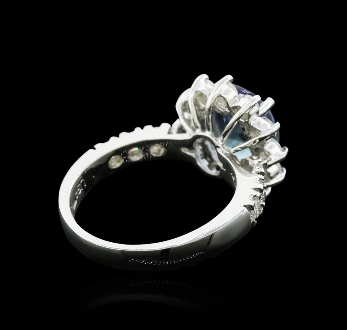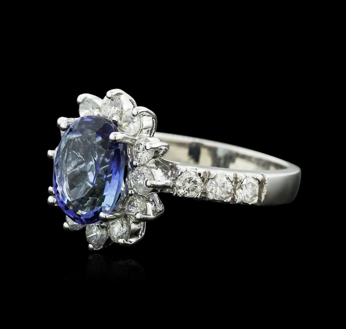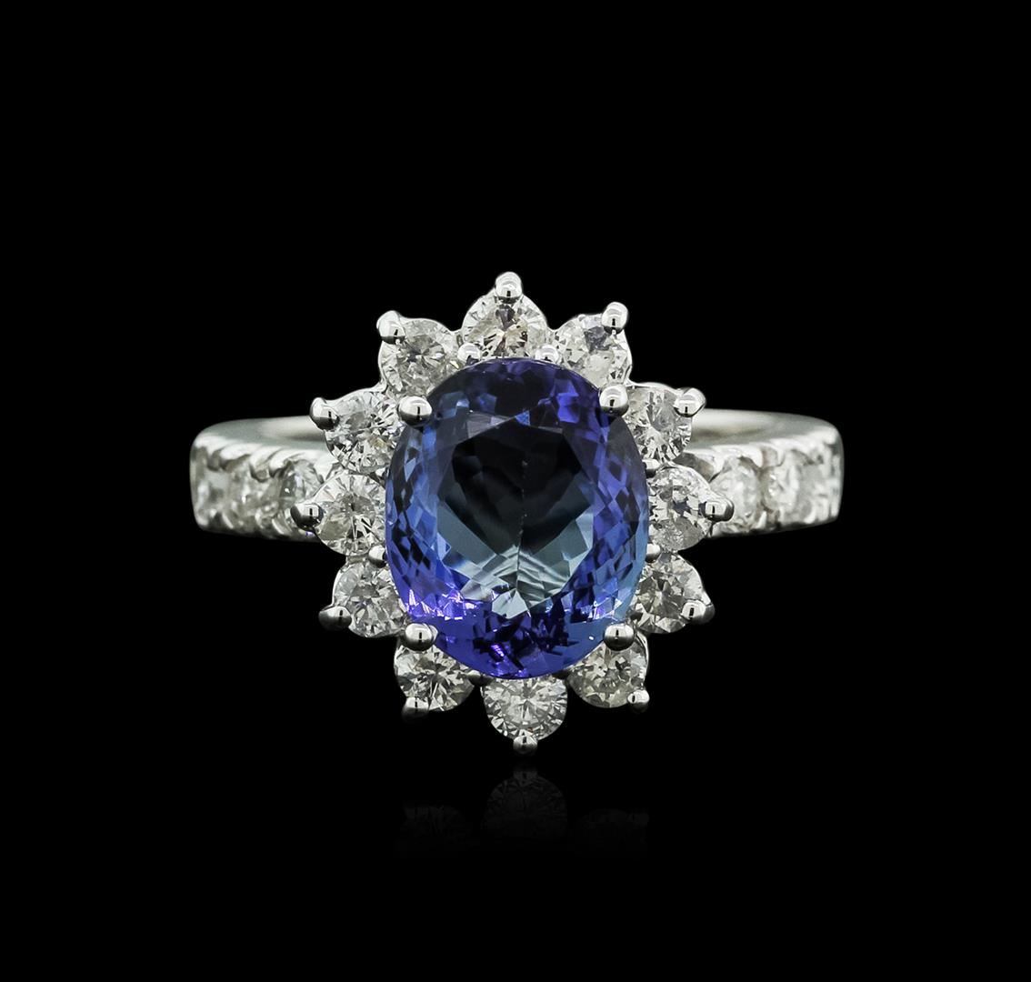 One polished, stamped, and tested 14K white gold ring mounted with: 1 genuine tanzanite center stone weighing 3.16 carat, and 18 genuine round diamonds weighing 1.11 carats. This item weighs 5.6 grams, condition is new, excellent workmanship. MAIN GEMSTONE: Species: Natural Zoisite. Variety: Tanzanite. Shape: Oval. Cutting Style: Brilliant Cut Crown Step Cut Pavilion. Measurements: 10.09 x 8.28 x 4.58 mm. Weight: 3.16 carat. Color: Violetish Blue. Cut Grade: Very Good. Refractive Index: 1.691 - 1.700 DR. Birefringence: 0.008 - 0.013. Hardness: 6.5 - 7. ADJACENT GEMSTONES ON RING: Identity: Natural Diamond. Shape: Round. Cutting Style: Brilliant Cut. Quantity: 18 Diamonds. Measurements: 2.5 - 2.7 mm. Total Weight: 1.11 carats. Clarity Grade: SI1 - SI3. Color Grade: G - I. Refractive Index: 2.418. Hardness: 10. Tanzanite Weight: 3.16 ct. Total Diamond Weight: 1.11 cts. Weight of Item: 5.6 grams. Gold Content: 14K White Gold. AIGL Appraised at $6,680.00.