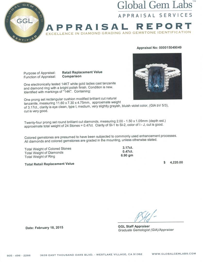 One electronically tested 14KT white gold ladies cast tanzanite and diamond ring with a bright polish finish. Identified with markings of "14K". Condition is new. Containing: One prong set rectangular cushion modified brilliant cut natural tanzanite, measuring 11.60 x 7.30 x 4.75mm, approximate weight of 3.17ct., clarity is eye clean, type I, medium, very slightly grayish, bluish violet color, (GIA bV 5/3), cut is very good. Twenty-Four prong set round brilliant cut diamonds, measuring 2.00 - 1.50 x 1.05mm (depth est.) approximate total weight of 24 Stones = 0.47ct. Clarity: SI-1 to SI-2. Color: I - J, Cut is Good. Colored gemstones are presumed to have been subjected to commonly used enhancement processes. All diamonds and colored gemstones are graded in the mounting, unless otherwise stated. Total Weight of Colored Stones 3.17ct. Total Weight of Diamonds 0.47ct. Total Weight of Ring 6.90 grams. GGL Appraised at $4,220.00.