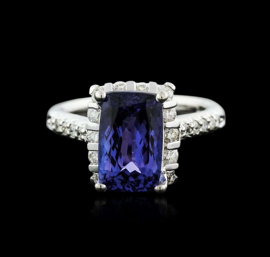 One electronically tested 14KT white gold ladies cast tanzanite and diamond ring with a bright polish finish. Identified with markings of "14K". Condition is new. Containing: One prong set rectangular cushion modified brilliant cut natural tanzanite, measuring 11.60 x 7.30 x 4.75mm, approximate weight of 3.17ct., clarity is eye clean, type I, medium, very slightly grayish, bluish violet color, (GIA bV 5/3), cut is very good. Twenty-Four prong set round brilliant cut diamonds, measuring 2.00 - 1.50 x 1.05mm (depth est.) approximate total weight of 24 Stones = 0.47ct. Clarity: SI-1 to SI-2. Color: I - J, Cut is Good. Colored gemstones are presumed to have been subjected to commonly used enhancement processes. All diamonds and colored gemstones are graded in the mounting, unless otherwise stated. Total Weight of Colored Stones 3.17ct. Total Weight of Diamonds 0.47ct. Total Weight of Ring 6.90 grams. GGL Appraised at $4,220.00.