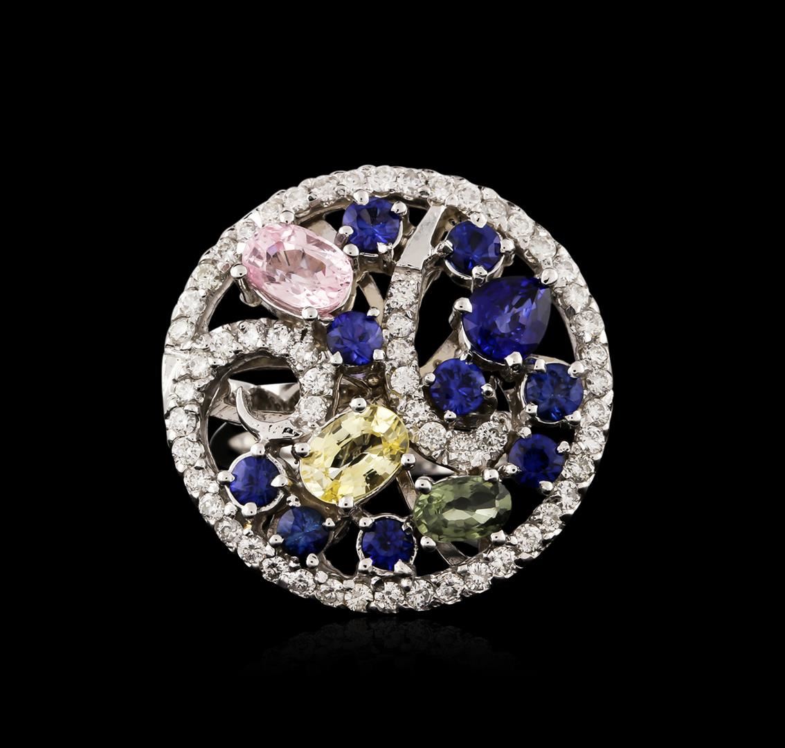 One electronically tested 14KT white gold ladies cast sapphire and diamond ring with a bright polish finish. Identified with markings of "14K". Condition is new. Containing: One prong set oval modified brilliant cut natural pink sapphire, measuring 6.00 x 4.00 x 2.60mm, approximate weight of 0.52ct., clarity is slightly included, type II, very light, slightly grayish, reddish purple color, (GIA rP 2/2), cut is good. One prong set oval modified brilliant cut natural yellow sapphire, measuring 7.50 x 4.00 x 2.60mm, approximate weight of 0.66ct., clarity is slightly included, type II, light, brownish, yellow color, (GIA Y 3/3), cut is good. One prong set oval modified brilliant cut natural green sapphire, measuring 4.50 x 3.00 x 1.95mm, approximate weight of 0.22ct., clarity is slightly included, type II, medium, very slightly grayish, green color, (GIA G 5/3), cut is good. One prong set pear modified brilliant cut natural blue sapphire, measuring 6.20 x 4.00 x 2.60mm, approximate weight of 0.52ct., clarity is slightly included, type II, medium, moderately strong, blue color, (GIA B 5/4), cut is good. Nine prong set round modified brilliant cut natural blue sapphires, measuring 3.00 - 3.00 x 1.95 mm, approximate total weight of 1.26ct., clarity is slightly included, type II, medium, moderately strong, blue color, (GIA B 5/4), cut is good. Fifty-Eight prong set round brilliant cut diamonds, measuring 1.50 - 1.50 x 0.90mm (depth est.) approximate total weight of 58 Stones = 0.71ct. Clarity of I-1 to I-2, Color of I - J, Cut is Good. Colored gemstones are presumed to have been subjected to commonly used enhancement processes. All diamonds and colored gemstones are graded in the mounting, unless otherwise stated. Total Weight of Colored Stones 3.18ct. Total Weight of Diamonds 0.71ct. Total Weight of Ring 10.60 grams. GGL Appraised at $5,485.00.