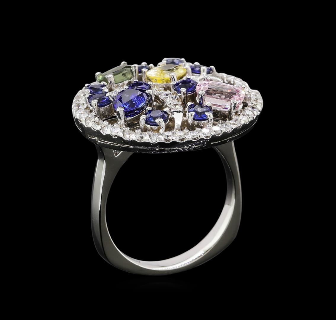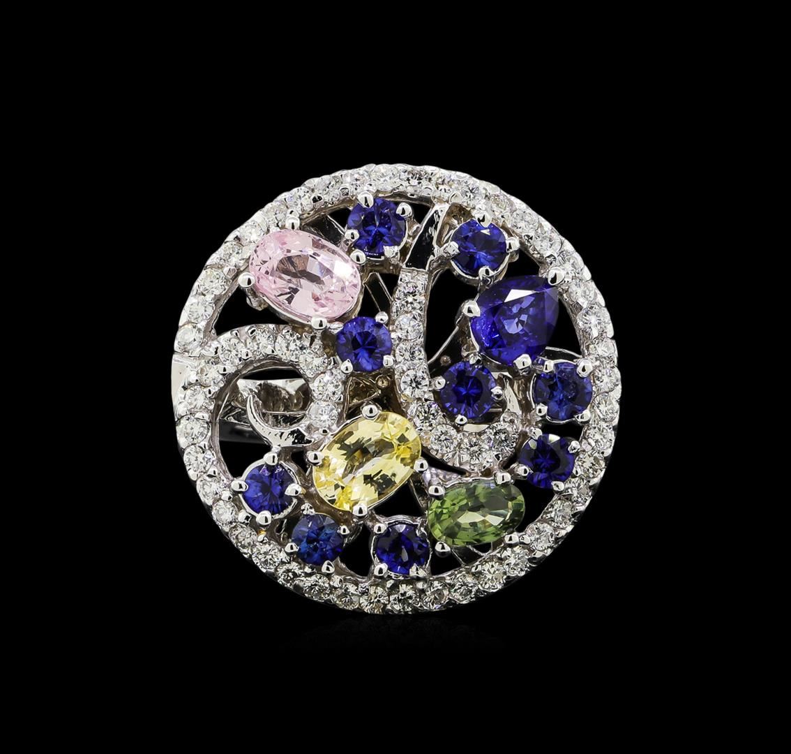 One electronically tested 14KT white gold ladies cast sapphire and diamond ring with a bright polish finish. Identified with markings of "14K". Condition is new. Containing: One prong set oval modified brilliant cut natural pink sapphire, measuring 6.00 x 4.00 x 2.60mm, approximate weight of 0.52ct., clarity is slightly included, type II, very light, slightly grayish, reddish purple color, (GIA rP 2/2), cut is good. One prong set oval modified brilliant cut natural yellow sapphire, measuring 7.50 x 4.00 x 2.60mm, approximate weight of 0.66ct., clarity is slightly included, type II, light, brownish, yellow color, (GIA Y 3/3), cut is good. One prong set oval modified brilliant cut natural green sapphire, measuring 4.50 x 3.00 x 1.95mm, approximate weight of 0.22ct., clarity is slightly included, type II, medium, very slightly grayish, green color, (GIA G 5/3), cut is good. One prong set pear modified brilliant cut natural blue sapphire, measuring 6.20 x 4.00 x 2.60mm, approximate weight of 0.52ct., clarity is slightly included, type II, medium, moderately strong, blue color, (GIA B 5/4), cut is good. Nine prong set round modified brilliant cut natural blue sapphires, measuring 3.00 - 3.00 x 1.95 mm, approximate total weight of 1.26ct., clarity is slightly included, type II, medium, moderately strong, blue color, (GIA B 5/4), cut is good. Fifty-Eight prong set round brilliant cut diamonds, measuring 1.50 - 1.50 x 0.90mm (depth est.) approximate total weight of 58 Stones = 0.71ct. Clarity of I-1 to I-2, Color of I - J, Cut is Good. Colored gemstones are presumed to have been subjected to commonly used enhancement processes. All diamonds and colored gemstones are graded in the mounting, unless otherwise stated. Total Weight of Colored Stones 3.18ct. Total Weight of Diamonds 0.71ct. Total Weight of Ring 10.60 grams. GGL Appraised at $5,485.00.