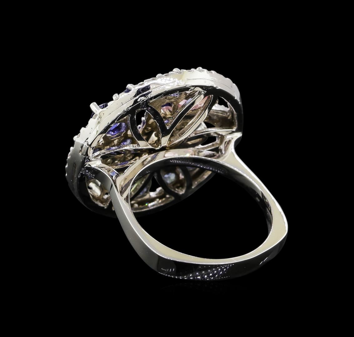 One electronically tested 14KT white gold ladies cast sapphire and diamond ring with a bright polish finish. Identified with markings of "14K". Condition is new. Containing: One prong set oval modified brilliant cut natural pink sapphire, measuring 6.00 x 4.00 x 2.60mm, approximate weight of 0.52ct., clarity is slightly included, type II, very light, slightly grayish, reddish purple color, (GIA rP 2/2), cut is good. One prong set oval modified brilliant cut natural yellow sapphire, measuring 7.50 x 4.00 x 2.60mm, approximate weight of 0.66ct., clarity is slightly included, type II, light, brownish, yellow color, (GIA Y 3/3), cut is good. One prong set oval modified brilliant cut natural green sapphire, measuring 4.50 x 3.00 x 1.95mm, approximate weight of 0.22ct., clarity is slightly included, type II, medium, very slightly grayish, green color, (GIA G 5/3), cut is good. One prong set pear modified brilliant cut natural blue sapphire, measuring 6.20 x 4.00 x 2.60mm, approximate weight of 0.52ct., clarity is slightly included, type II, medium, moderately strong, blue color, (GIA B 5/4), cut is good. Nine prong set round modified brilliant cut natural blue sapphires, measuring 3.00 - 3.00 x 1.95 mm, approximate total weight of 1.26ct., clarity is slightly included, type II, medium, moderately strong, blue color, (GIA B 5/4), cut is good. Fifty-Eight prong set round brilliant cut diamonds, measuring 1.50 - 1.50 x 0.90mm (depth est.) approximate total weight of 58 Stones = 0.71ct. Clarity of I-1 to I-2, Color of I - J, Cut is Good. Colored gemstones are presumed to have been subjected to commonly used enhancement processes. All diamonds and colored gemstones are graded in the mounting, unless otherwise stated. Total Weight of Colored Stones 3.18ct. Total Weight of Diamonds 0.71ct. Total Weight of Ring 10.60 grams. GGL Appraised at $5,485.00.