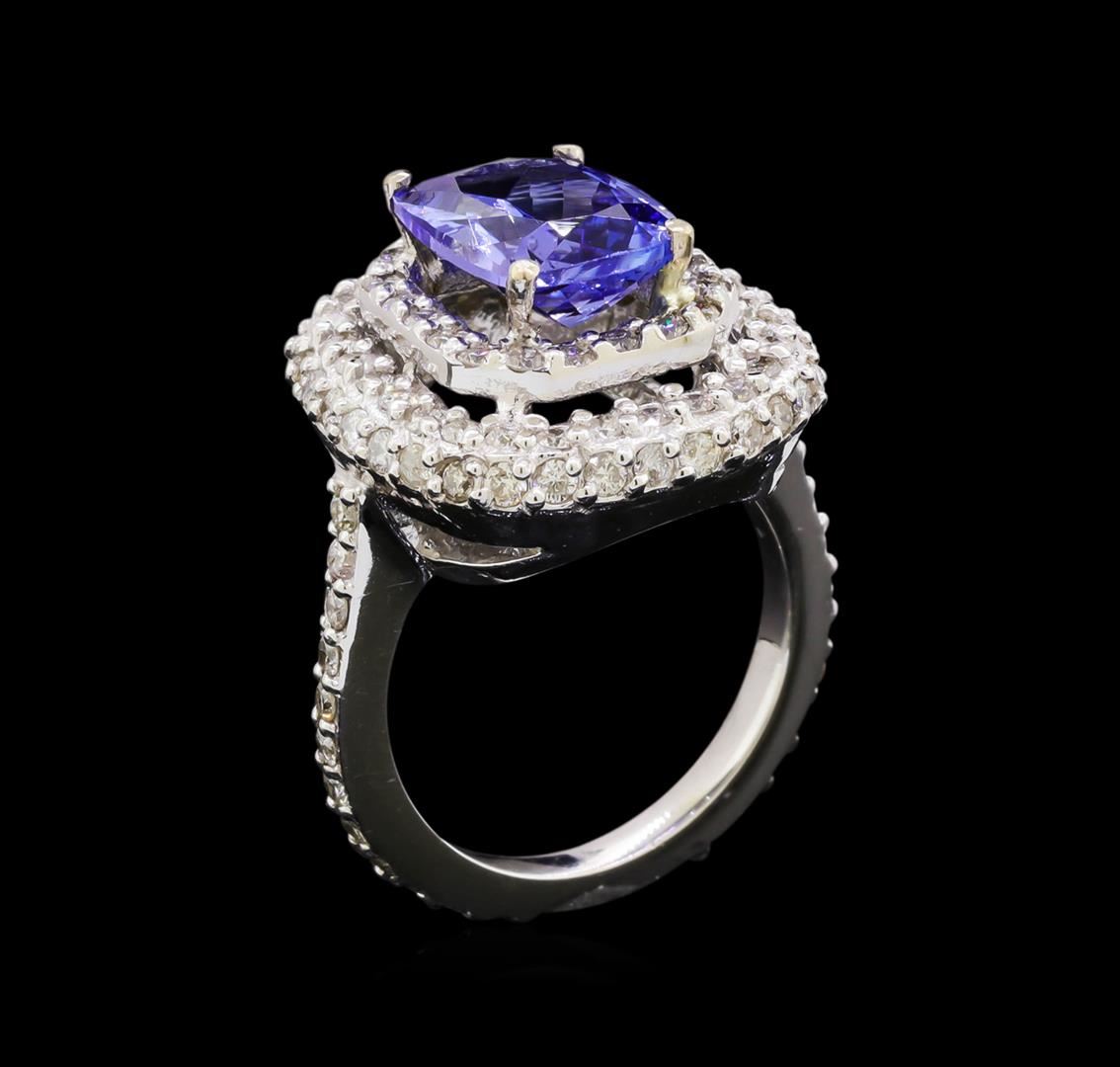 One electronically tested 14KT white gold ladies combination cast & assembled tanzanite and diamond ring with a flat shank with a bright polish finish. Identified with markings of "14K". Condition is new. Containing: One prong set rectangular cushion modified brilliant cut natural tanzanite, measuring 10.40 x 8.16 x 4.76mm, approximate weight of 3.18ct., clarity is eye clean, type I, medium light, very slightly grayish, violet color, (GIA V 4/3), cut is good. One Hundred Three prong set round brilliant cut diamonds, measuring 1.70 - 1.20 x 0.87mm (depth est.) approximate total weight of 103 Stones = 1.14ct. Clarity: I-1 to I-2. Color: I - J, Cut is Good. Colored gemstones are presumed to have been subjected to commonly used enhancement processes. All diamonds and colored gemstones are graded in the mounting, unless otherwise stated. Total Weight of Colored Stones 3.18ct. Total Weight of Diamonds 1.14ct. Total Weight of Ring 9.60 grams. GGL Appraised at $9,565.00.