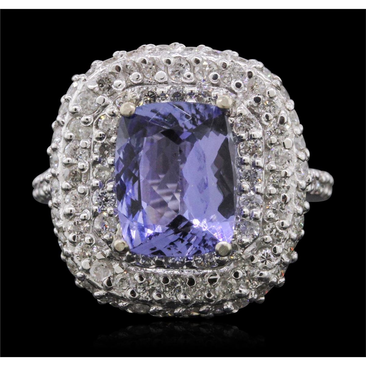 One electronically tested 14KT white gold ladies combination cast & assembled tanzanite and diamond ring with a flat shank with a bright polish finish. Identified with markings of "14K". Condition is new. Containing: One prong set rectangular cushion modified brilliant cut natural tanzanite, measuring 10.40 x 8.16 x 4.76mm, approximate weight of 3.18ct., clarity is eye clean, type I, medium light, very slightly grayish, violet color, (GIA V 4/3), cut is good. One Hundred Three prong set round brilliant cut diamonds, measuring 1.70 - 1.20 x 0.87mm (depth est.) approximate total weight of 103 Stones = 1.14ct. Clarity: I-1 to I-2. Color: I - J, Cut is Good. Colored gemstones are presumed to have been subjected to commonly used enhancement processes. All diamonds and colored gemstones are graded in the mounting, unless otherwise stated. Total Weight of Colored Stones 3.18ct. Total Weight of Diamonds 1.14ct. Total Weight of Ring 9.60 grams. GGL Appraised at $9,565.00.