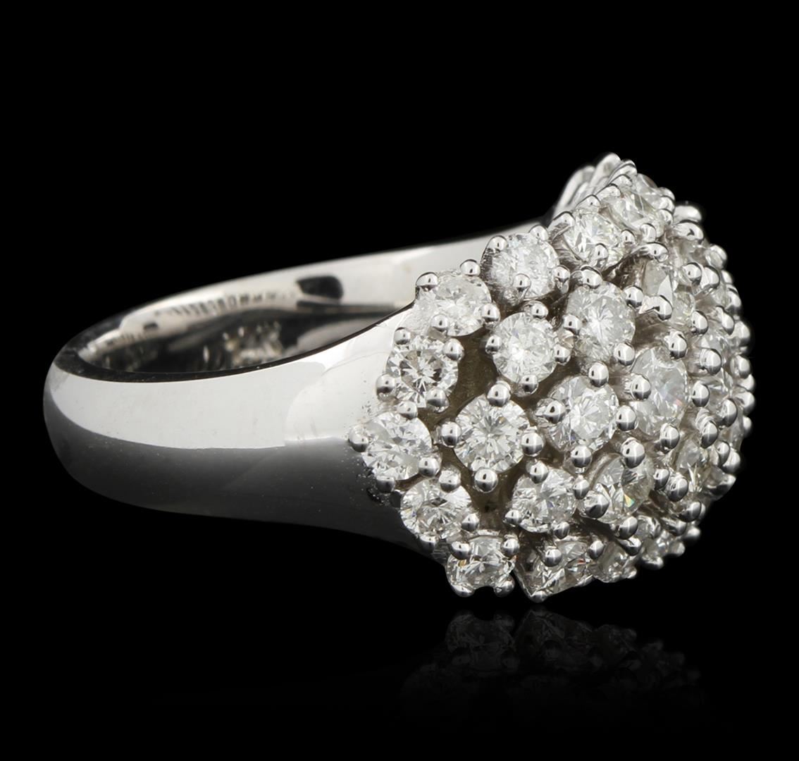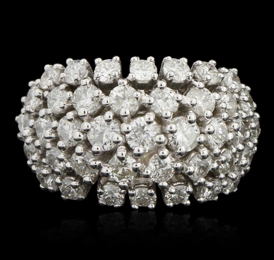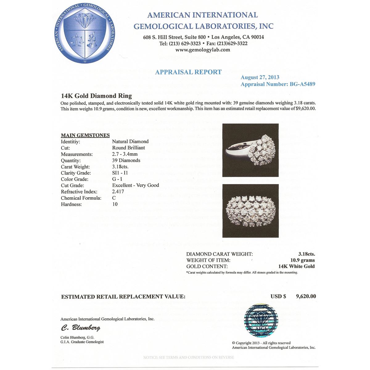 One polished, stamped, and electronically tested solid 14KT White Gold ring mounted with: 39 genuine diamonds weighing 3.18 carats. This item weighs 10.9 grams, condition is new, excellent workmanship. AIGL Appraised at $9,620.00.