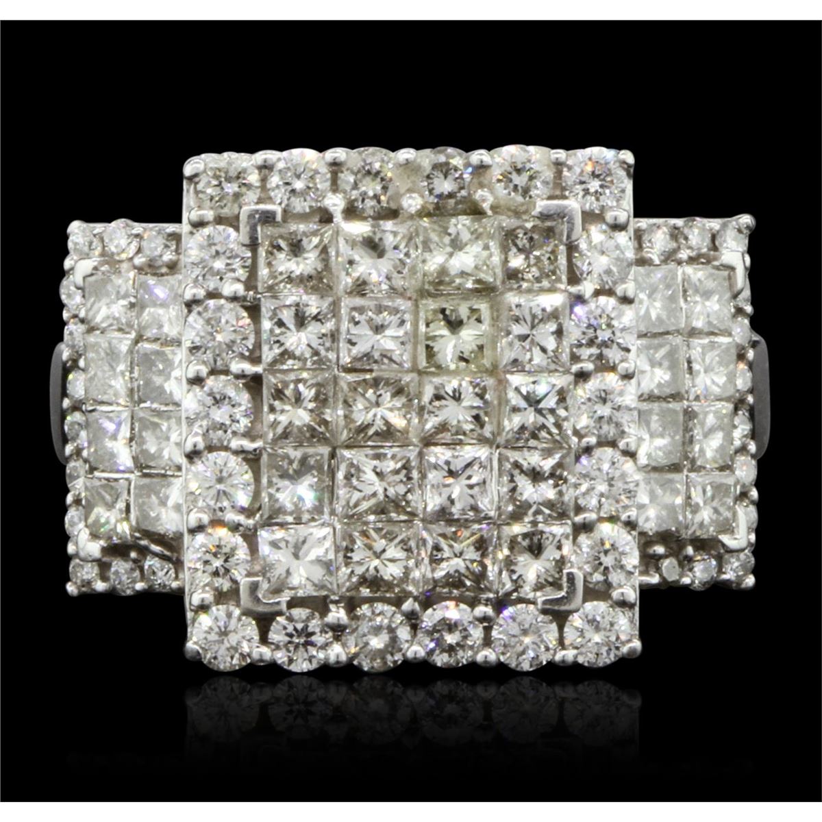 One electronically tested 14KT white gold Ladies combination cast & assembled cluster ring with a bright polish finish. Condition is excellent. Identified with markings of "14K". Containing: Forty-One invisible set princess cut diamonds, measuring 2.40 x 2.00 x 1.50mm (depth est.) approximate total weight of 41 Stones = 2.42ct. Clarity of SI-1 to SI-2, Color of H - J, Cut is Good. Twenty-Four bead set round brilliant cut diamonds, measuring 1.10 - 1.10 x 0.66mm (depth est.) approximate total weight of 24 Stones = 0.12ct. Clarity of I-1 to I-2, Color of G - H, Cut is Very Good. Twenty-Two bead set round brilliant cut diamonds, measuring 2.00 - 2.00 x 1.20mm (depth est.) approximate total weight of 22 Stones = 0.64ct. Clarity of SI-2, Color of H - I, Cut is Good. Total Weight of Diamonds 3.18ct. Total Weight of Ring 7.40gm. GGL Appraised at $9,780.00.