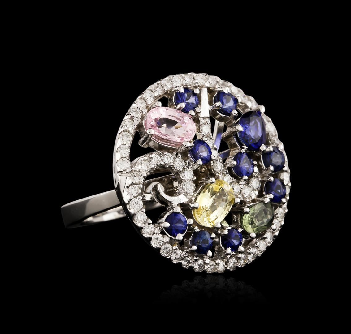 One electronically tested 14KT white gold ladies cast sapphire and diamond ring with a bright polish finish. Identified with markings of "14K". Condition is new. Containing: One prong set oval modified brilliant cut natural pink sapphire, measuring 6.00 x 4.00 x 2.60mm, approximate weight of 0.52ct., clarity is slightly included, type II, very light, slightly grayish, reddish purple color, (GIA rP 2/2), cut is good. One prong set oval modified brilliant cut natural yellow sapphire, measuring 7.50 x 4.00 x 2.60mm, approximate weight of 0.66ct., clarity is slightly included, type II, light, brownish, yellow color, (GIA Y 3/3), cut is good. One prong set oval modified brilliant cut natural green sapphire, measuring 4.50 x 3.00 x 1.95mm, approximate weight of 0.22ct., clarity is slightly included, type II, medium, very slightly grayish, green color, (GIA G 5/3), cut is good. One prong set pear modified brilliant cut natural blue sapphire, measuring 6.20 x 4.00 x 2.60mm, approximate weight of 0.52ct., clarity is slightly included, type II, medium, moderately strong, blue color, (GIA B 5/4), cut is good. Nine prong set round modified brilliant cut natural blue sapphires, measuring 3.00 - 3.00 x 1.95 mm, approximate total weight of 1.26ct., clarity is slightly included, type II, medium, moderately strong, blue color, (GIA B 5/4), cut is good. Fifty-Eight prong set round brilliant cut diamonds, measuring 1.50 - 1.50 x 0.90mm (depth est.) approximate total weight of 58 Stones = 0.71ct. Clarity of I-1 to I-2, Color of I - J, Cut is Good. Colored gemstones are presumed to have been subjected to commonly used enhancement processes. All diamonds and colored gemstones are graded in the mounting, unless otherwise stated. Total Weight of Colored Stones 3.18ct. Total Weight of Diamonds 0.71ct. Total Weight of Ring 10.60 grams. GGL Appraised at $5,485.00.
