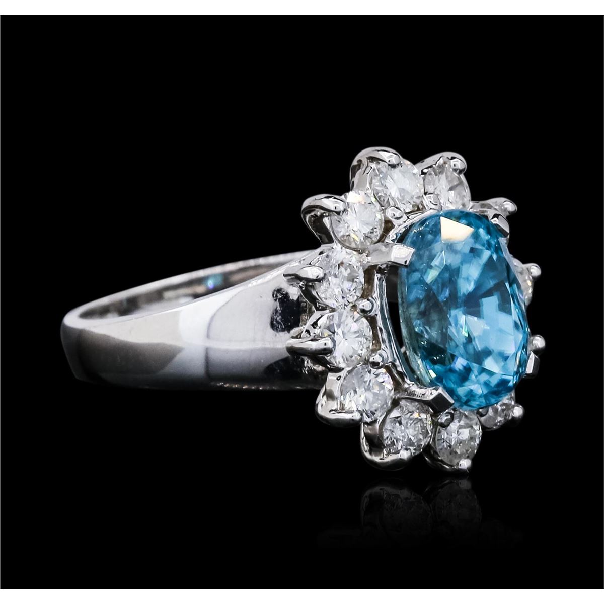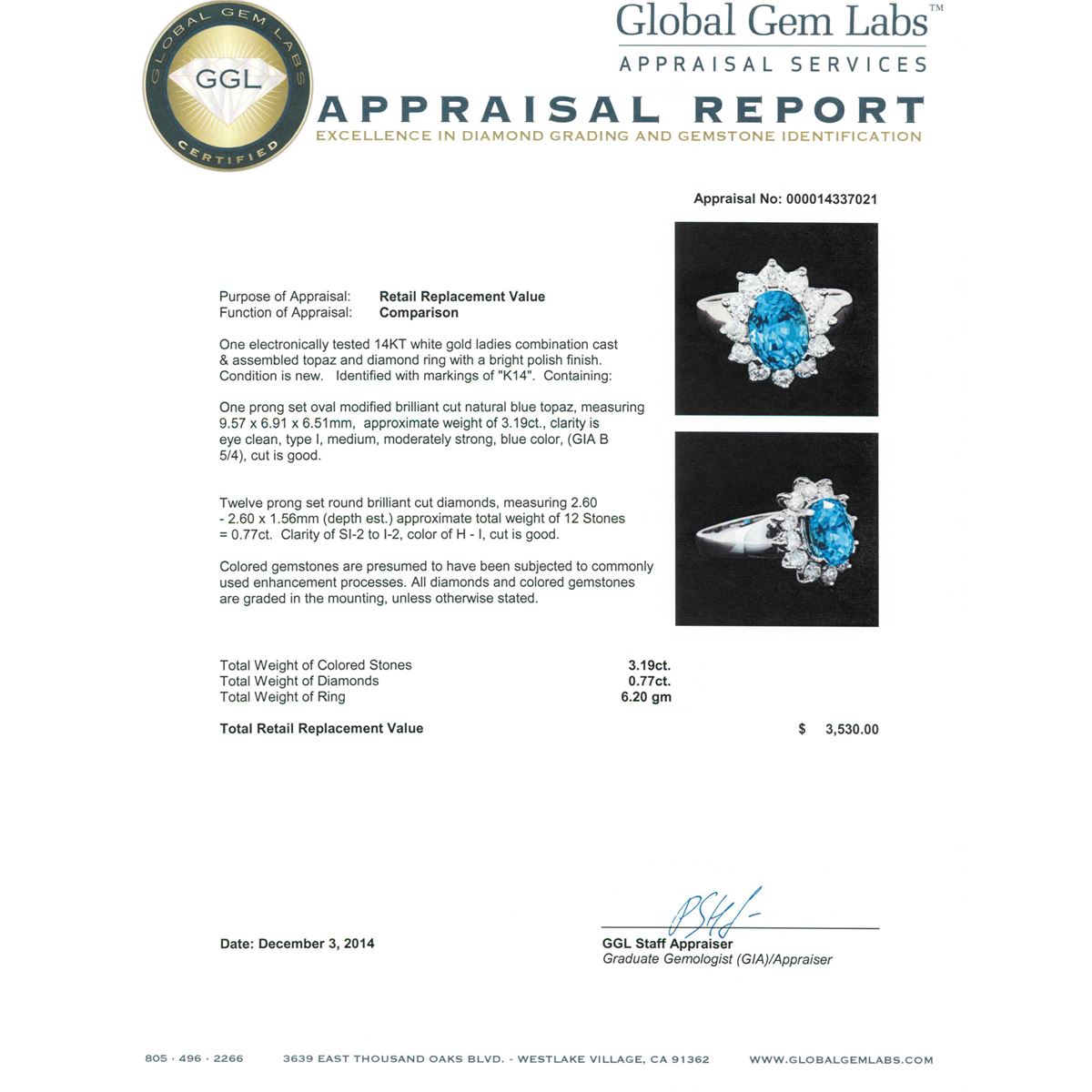 One electronically tested 14KT white gold ladies combination cast & assembled topaz and diamond ring with a bright polish finish. Identified with markings of "K14". Condition is new. Containing: One prong set oval modified brilliant cut natural blue topaz, measuring 9.57 x 6.91 x 6.51mm, approximate weight of 3.19ct., clarity is eye clean, type I, medium, moderately strong, blue color, (GIA B 5/4), cut is good. Twelve prong set round brilliant cut diamonds, measuring 2.60 - 2.60 x 1.56mm (depth est.) approximate total weight of 12 Stones = 0.77ct. Clarity: SI-2 to I-2. Color: H - I, Cut is Good. Colored gemstones are presumed to have been subjected to commonly used enhancement processes. All diamonds and colored gemstones are graded in the mounting, unless otherwise stated. Total Weight of Colored Stones 3.19ct. Total Weight of Diamonds 0.77ct. Total Weight of Ring 6.20 grams. GGL Appraised at $3,530.00.