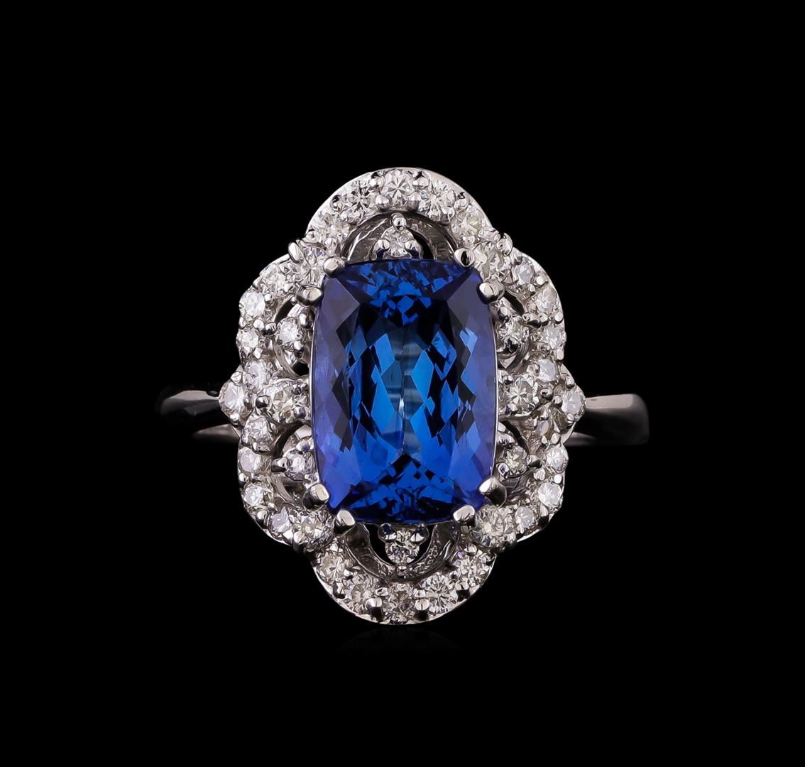One electronically tested 14KT white gold ladies cast tanzanite and diamond ring with a bright polish finish. Identified with markings of "K14". Condition is new. Containing: One prong set rectangular cushion modified brilliant cut natural tanzanite, measuring 11.10 x 7.50 x 4.88mm, approximate weight of 3.20ct., clarity is eye clean, type I, medium light, very slightly grayish, violet color, (GIA V 4/3), cut is good. Forty prong set round brilliant cut diamonds, measuring 1.30 - 1.30 x 0.78mm (depth est.) approximate total weight of 40 Stones = 0.32ct. Clarity: SI-2 to I-1. Color: H - I, Cut is Good. Colored gemstones are presumed to have been subjected to commonly used enhancement processes. All diamonds and colored gemstones are graded in the mounting, unless otherwise stated. Total Weight of Colored Stones 3.20ct. Total Weight of Diamonds 0.32ct. Total Weight of Ring 5.40 grams. GGL Appraised at $4,475.00.