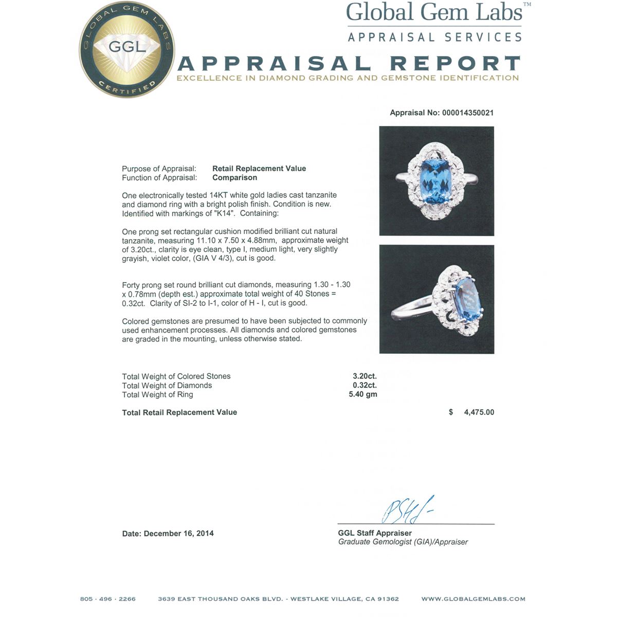 One electronically tested 14KT white gold ladies cast tanzanite and diamond ring with a bright polish finish. Identified with markings of "K14". Condition is new. Containing: One prong set rectangular cushion modified brilliant cut natural tanzanite, measuring 11.10 x 7.50 x 4.88mm, approximate weight of 3.20ct., clarity is eye clean, type I, medium light, very slightly grayish, violet color, (GIA V 4/3), cut is good. Forty prong set round brilliant cut diamonds, measuring 1.30 - 1.30 x 0.78mm (depth est.) approximate total weight of 40 Stones = 0.32ct. Clarity: SI-2 to I-1. Color: H - I, Cut is Good. Colored gemstones are presumed to have been subjected to commonly used enhancement processes. All diamonds and colored gemstones are graded in the mounting, unless otherwise stated. Total Weight of Colored Stones 3.20ct. Total Weight of Diamonds 0.32ct. Total Weight of Ring 5.40 grams. GGL Appraised at $4,475.00.