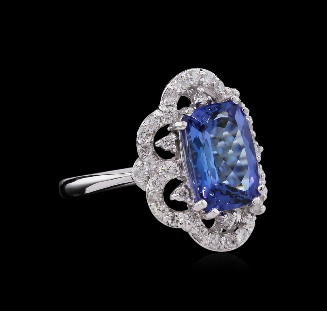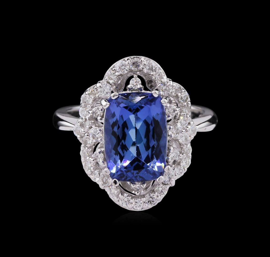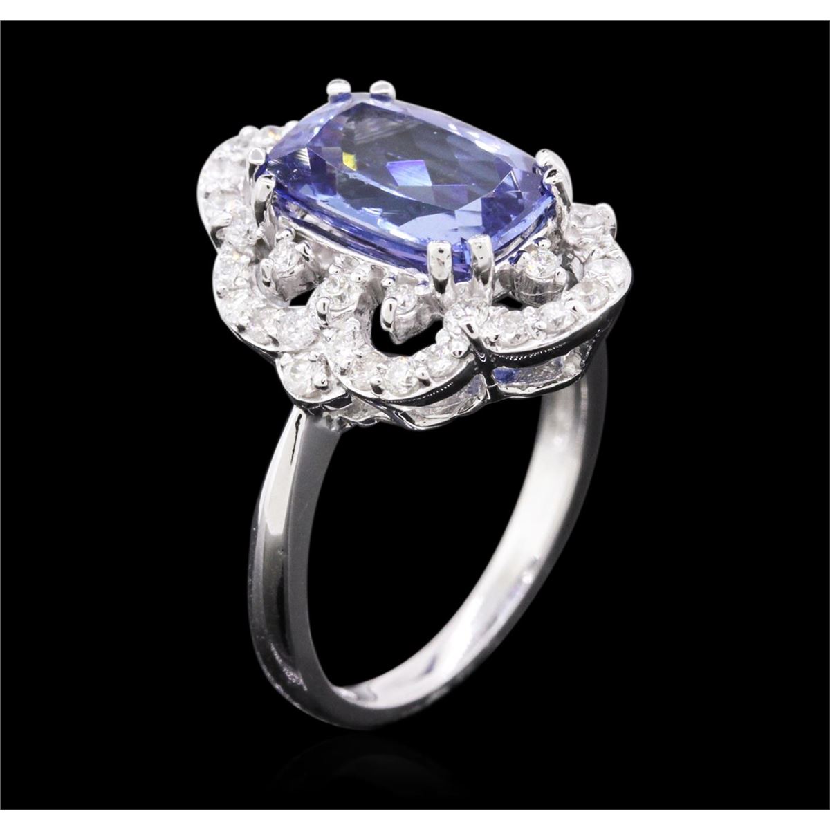 One electronically tested 14KT white gold ladies cast tanzanite and diamond ring with a bright polish finish. Identified with markings of "K14". Condition is new. Containing: One prong set rectangular cushion modified brilliant cut natural tanzanite, measuring 11.10 x 7.50 x 4.88mm, approximate weight of 3.20ct., clarity is eye clean, type I, medium light, very slightly grayish, violet color, (GIA V 4/3), cut is good. Forty prong set round brilliant cut diamonds, measuring 1.30 - 1.30 x 0.78mm (depth est.) approximate total weight of 40 Stones = 0.32ct. Clarity: SI-2 to I-1. Color: H - I, Cut is Good. Colored gemstones are presumed to have been subjected to commonly used enhancement processes. All diamonds and colored gemstones are graded in the mounting, unless otherwise stated. Total Weight of Colored Stones 3.20ct. Total Weight of Diamonds 0.32ct. Total Weight of Ring 5.40 grams. GGL Appraised at $4,475.00.