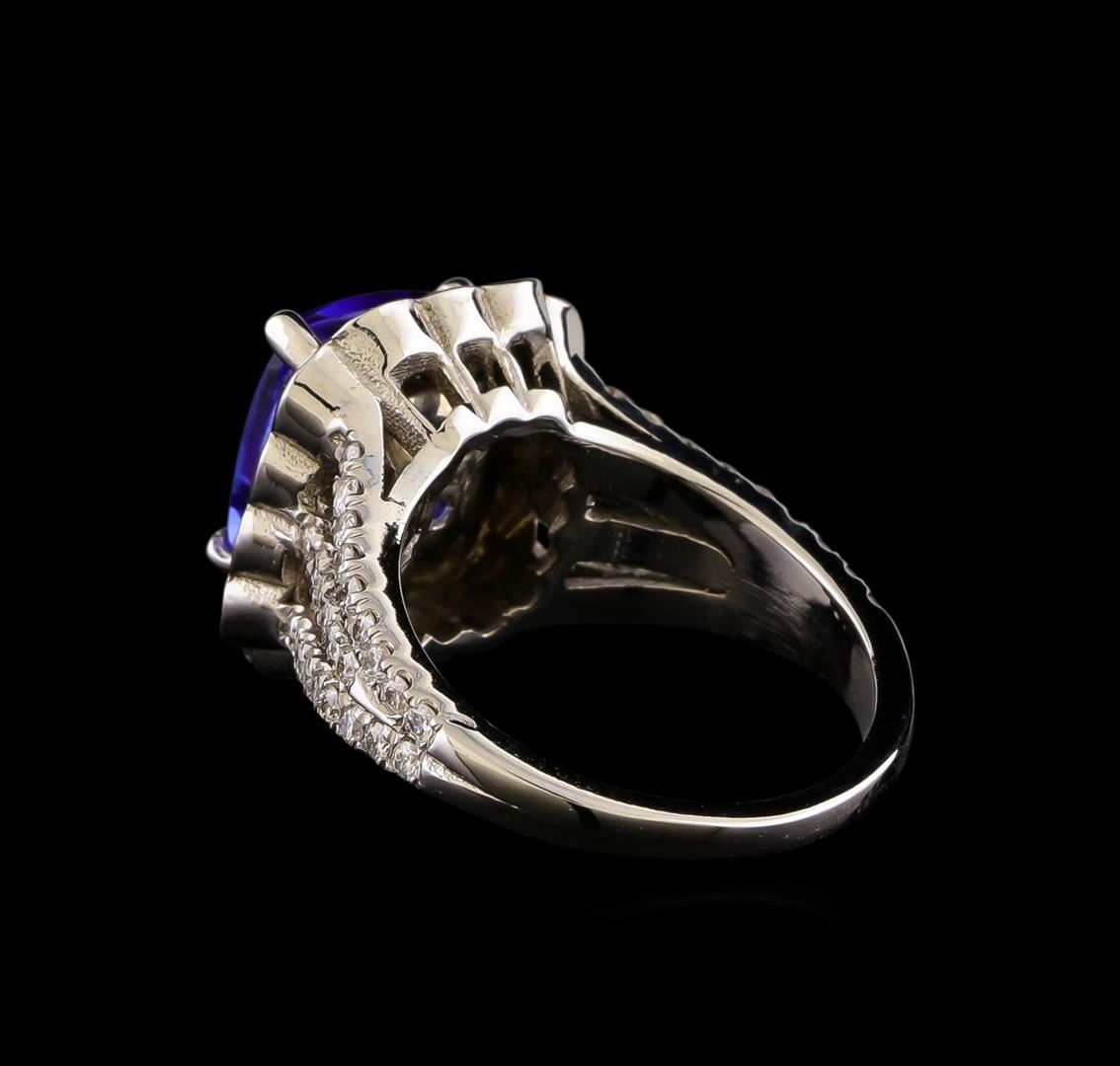 One electronically tested 14KT white gold ladies combination cast & assembled tanzanite and diamond ring with a bright polish finish. Identified with markings of "14K". Condition is new. Containing: One prong set rectangular cushion modified brilliant cut natural tanzanite, measuring 9.93 x 7.95 x 5.17mm, approximate weight of 3.21ct., clarity is eye clean, type I, medium light, very slightly grayish, violet color, (GIA V 4/3), cut is good. Forty-Eight prong set round brilliant cut diamonds, measuring 1.50 - 1.50 x 0.90mm (depth est.) approximate total weight of 48 Stones = 0.59ct. Clarity: SI-2 to I-1. Color: I - J, Cut is Good. Fourteen prong set round brilliant cut diamonds, measuring 2.50 - 2.50 x 1.50mm (depth est.) approximate total weight of 14 Stones = 0.80ct. Clarity: SI-2 to I-1. Color: I - J, Cut is Good. Colored gemstones are presumed to have been subjected to commonly used enhancement processes. All diamonds and colored gemstones are graded in the mounting, unless otherwise stated. Total Weight of Colored Stones 3.21ct. Total Weight of Diamonds 1.39ct. Total Weight of Ring 7.20 grams. GGL Appraised at $7,135.00.