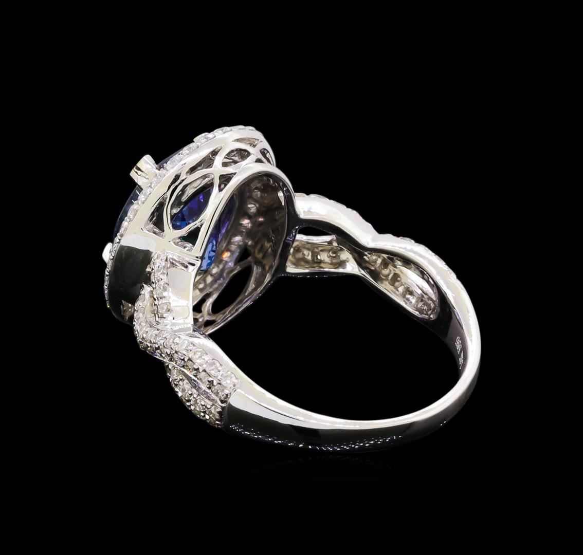 One electronically tested 14KT white gold ladies cast tanzanite & diamond ring with a bright finish. The featured tanzanite is set within a diamond bezel, supported by intertwined diamond set ribbons, complete by a two millimeter wide band. Trademark is UCG. Identified with markings of "14K". Condition is new, good workmanship. Containing: One prong set oval mixed cut natural tanzanite, measuring 10.00 x 8.00 x 5.38mm, 10% bulge factor, approximate weight of 3.21ct., clarity is slightly included, type I, medium dark, grayish, bluish violet color, (GIA bV 6/1), cut is good. Transmitting light with no distortion, transparent. Graded in the setting. Tanzanite is a very rare gemstone that is only found in the country of Tanzania. Originally discovered in 1967. Tiffany & Company, named the stone Tanzanite. It is found in the Usumburu Mountains that border the Umba Valley of northern Tanzania. Tanzanite occurs in gray, brown, violet, blue, reddish-purple, & green. The gem is interesting because of its exceptional pleochroism. Rotated in different directions a tanzanite will exhibit multiple changes of color. Tanzanite has a low tolerance to ultrasonic cleaning, and should not be cleaned using this method. One Hundred Thirty-Four prong set round brilliant cut diamonds, measuring 1.20 - 1.00 x 0.66mm (depth est.) approximate total weight of 134 Stones = 0.67ct. Graded in the setting. Clarity: SI-2 to I-2. Color: H - J. Total Weight of Colored Stones 3.21ct. Total Weight of Diamonds 0.67ct. Total Weight of Ring 4.98 grams. AIG Appraised at $8,740.00.