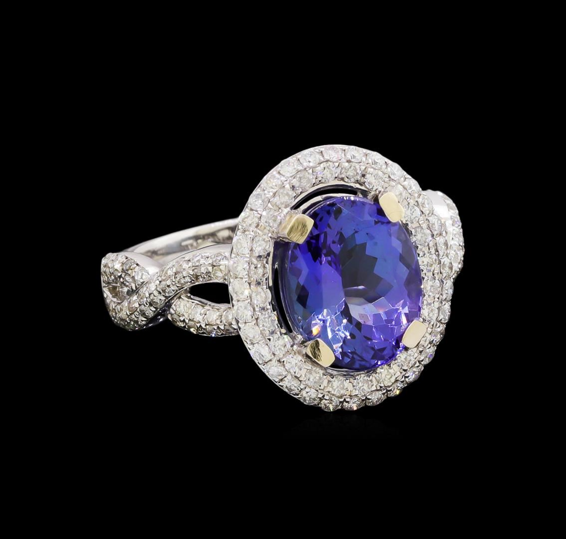 One electronically tested 14KT white gold ladies cast tanzanite & diamond ring with a bright finish. The featured tanzanite is set within a diamond bezel, supported by intertwined diamond set ribbons, complete by a two millimeter wide band. Trademark is UCG. Identified with markings of "14K". Condition is new, good workmanship. Containing: One prong set oval mixed cut natural tanzanite, measuring 10.00 x 8.00 x 5.38mm, 10% bulge factor, approximate weight of 3.21ct., clarity is slightly included, type I, medium dark, grayish, bluish violet color, (GIA bV 6/1), cut is good. Transmitting light with no distortion, transparent. Graded in the setting. Tanzanite is a very rare gemstone that is only found in the country of Tanzania. Originally discovered in 1967. Tiffany & Company, named the stone Tanzanite. It is found in the Usumburu Mountains that border the Umba Valley of northern Tanzania. Tanzanite occurs in gray, brown, violet, blue, reddish-purple, & green. The gem is interesting because of its exceptional pleochroism. Rotated in different directions a tanzanite will exhibit multiple changes of color. Tanzanite has a low tolerance to ultrasonic cleaning, and should not be cleaned using this method. One Hundred Thirty-Four prong set round brilliant cut diamonds, measuring 1.20 - 1.00 x 0.66mm (depth est.) approximate total weight of 134 Stones = 0.67ct. Graded in the setting. Clarity: SI-2 to I-2. Color: H - J. Total Weight of Colored Stones 3.21ct. Total Weight of Diamonds 0.67ct. Total Weight of Ring 4.98 grams. AIG Appraised at $8,740.00.