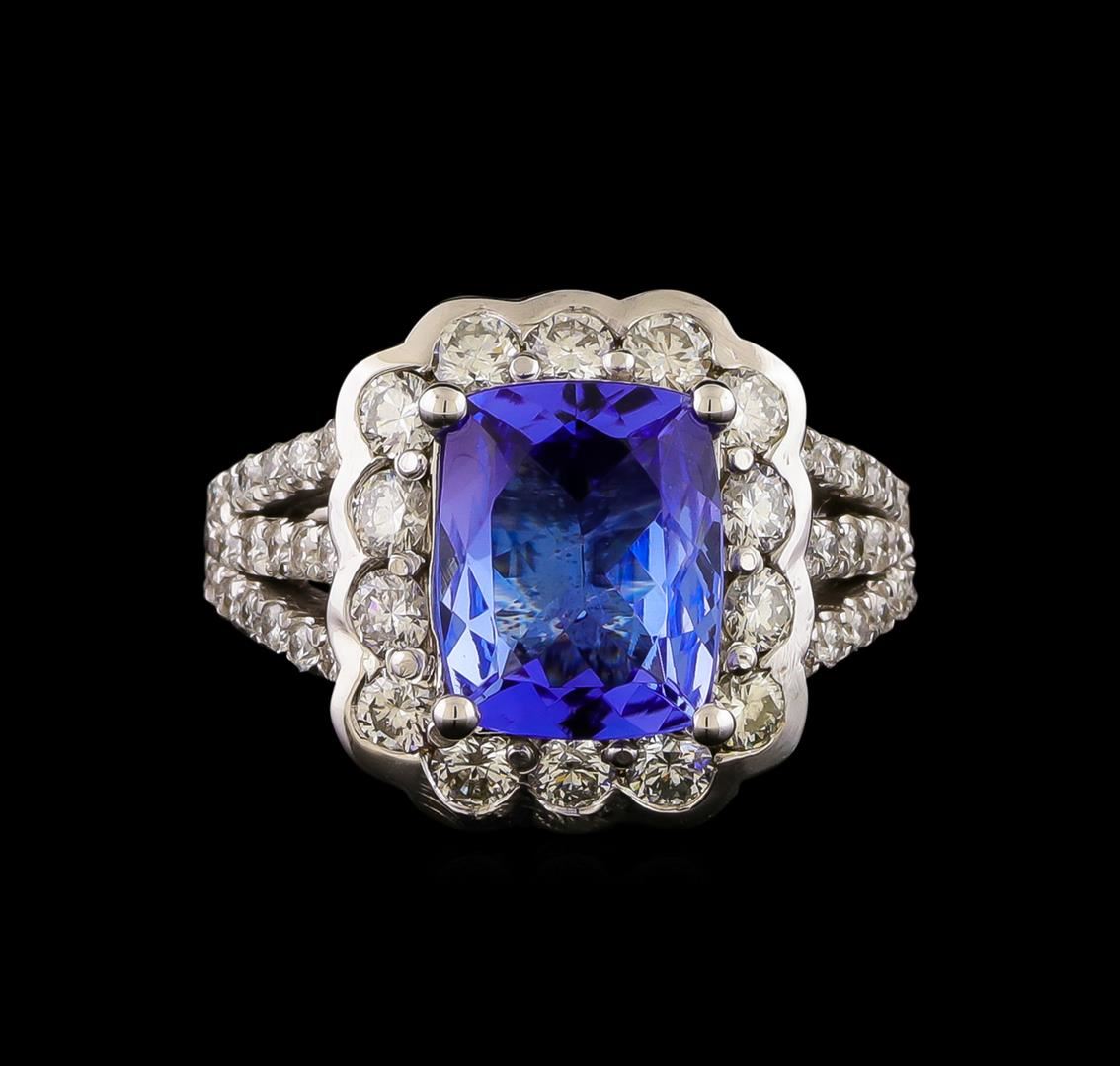 One electronically tested 14KT white gold ladies combination cast & assembled tanzanite and diamond ring with a bright polish finish. Identified with markings of "14K". Condition is new. Containing: One prong set rectangular cushion modified brilliant cut natural tanzanite, measuring 9.93 x 7.95 x 5.17mm, approximate weight of 3.21ct., clarity is eye clean, type I, medium light, very slightly grayish, violet color, (GIA V 4/3), cut is good. Forty-Eight prong set round brilliant cut diamonds, measuring 1.50 - 1.50 x 0.90mm (depth est.) approximate total weight of 48 Stones = 0.59ct. Clarity: SI-2 to I-1. Color: I - J, Cut is Good. Fourteen prong set round brilliant cut diamonds, measuring 2.50 - 2.50 x 1.50mm (depth est.) approximate total weight of 14 Stones = 0.80ct. Clarity: SI-2 to I-1. Color: I - J, Cut is Good. Colored gemstones are presumed to have been subjected to commonly used enhancement processes. All diamonds and colored gemstones are graded in the mounting, unless otherwise stated. Total Weight of Colored Stones 3.21ct. Total Weight of Diamonds 1.39ct. Total Weight of Ring 7.20 grams. GGL Appraised at $7,135.00.