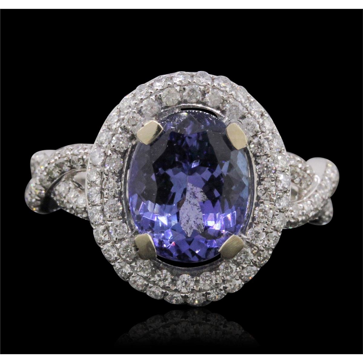 One electronically tested 14KT white gold ladies cast tanzanite & diamond ring with a bright finish. The featured tanzanite is set within a diamond bezel, supported by intertwined diamond set ribbons, complete by a two millimeter wide band. Trademark is UCG. Identified with markings of "14K". Condition is new, good workmanship. Containing: One prong set oval mixed cut natural tanzanite, measuring 10.00 x 8.00 x 5.38mm, 10% bulge factor, approximate weight of 3.21ct., clarity is slightly included, type I, medium dark, grayish, bluish violet color, (GIA bV 6/1), cut is good. Transmitting light with no distortion, transparent. Graded in the setting. Tanzanite is a very rare gemstone that is only found in the country of Tanzania. Originally discovered in 1967. Tiffany & Company, named the stone Tanzanite. It is found in the Usumburu Mountains that border the Umba Valley of northern Tanzania. Tanzanite occurs in gray, brown, violet, blue, reddish-purple, & green. The gem is interesting because of its exceptional pleochroism. Rotated in different directions a tanzanite will exhibit multiple changes of color. Tanzanite has a low tolerance to ultrasonic cleaning, and should not be cleaned using this method. One Hundred Thirty-Four prong set round brilliant cut diamonds, measuring 1.20 - 1.00 x 0.66mm (depth est.) approximate total weight of 134 Stones = 0.67ct. Graded in the setting. Clarity: SI-2 to I-2. Color: H - J. Total Weight of Colored Stones 3.21ct. Total Weight of Diamonds 0.67ct. Total Weight of Ring 4.98 grams. AIG Appraised at $8,740.00.