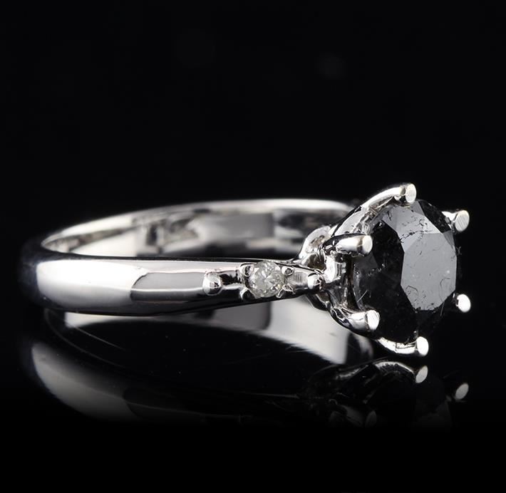 One electronically tested 14KT white gold ladies cast three diamond ring with a bright finish. Condition is new, good workmanship. The featured black diamond is set within tapering diamond set shoulders, completed by a three millimeter wide band. Identified with markings of "14K". Containing: One prong set round brilliant cut diamond, measuring 8.40 - 8.38 x 6.67mm (depth est.), 9.00% GTCF approximate weight of 3.22ct. Indications of multiple laboratory enhancements. Graded in the setting. Clarity Declasse. Color fancy black; irradiated. depth 79.4%. Table 59.5%. Two prong set round brilliant cut diamonds, measuring 1.90 - 1.90 x 1.14mm (depth est.) approximate total weight of 2 stones = 0.05ct. Graded in the setting. Clarity I-1. Color I - J. Total weight of diamonds 3.27ct. Total weight of ring 4.14gm. AIG Appraised at $3,930.00.