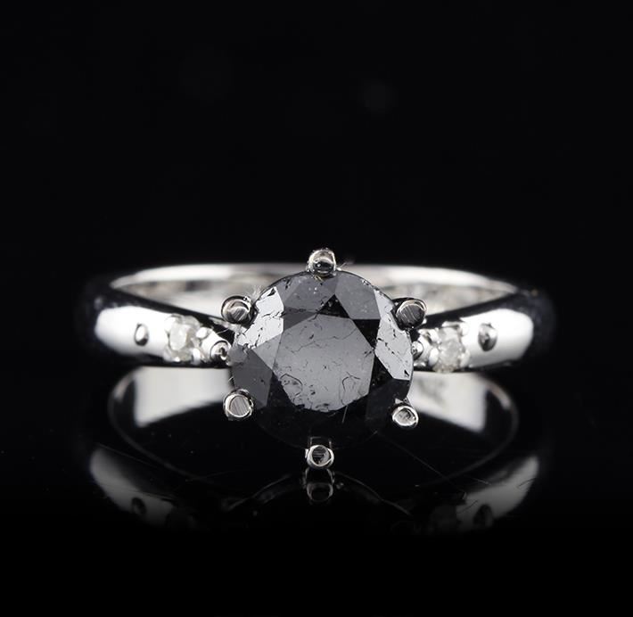One electronically tested 14KT white gold ladies cast three diamond ring with a bright finish. Condition is new, good workmanship. The featured black diamond is set within tapering diamond set shoulders, completed by a three millimeter wide band. Identified with markings of "14K". Containing: One prong set round brilliant cut diamond, measuring 8.40 - 8.38 x 6.67mm (depth est.), 9.00% GTCF approximate weight of 3.22ct. Indications of multiple laboratory enhancements. Graded in the setting. Clarity Declasse. Color fancy black; irradiated. depth 79.4%. Table 59.5%. Two prong set round brilliant cut diamonds, measuring 1.90 - 1.90 x 1.14mm (depth est.) approximate total weight of 2 stones = 0.05ct. Graded in the setting. Clarity I-1. Color I - J. Total weight of diamonds 3.27ct. Total weight of ring 4.14gm. AIG Appraised at $3,930.00.
