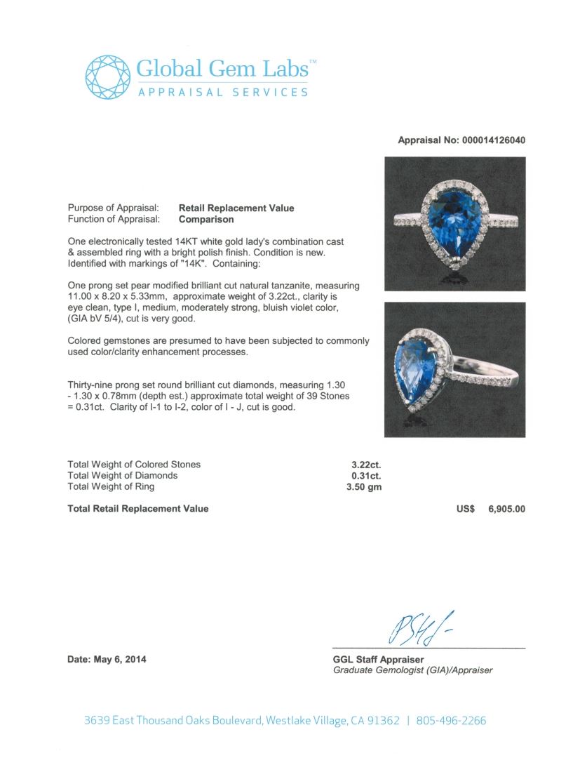 One electronically tested 14KT white gold Ladies combination cast & assembled ring with a bright polish finish. Condition is new. Identified with markings of "14K". Containing: One prong set pear modified brilliant cut natural tanzanite, measuring 11.00 x 8.20 x 5.33mm, approximate weight of 3.22ct., clarity is eye clean, type I, medium, moderately strong, bluish violet color, (GIA bV 5/4), cut is very good. Colored gemstones are presumed to have been subjected to commonly used color/clarity enhancement processes. Thirty-Nine prong set round brilliant cut diamonds, measuring 1.30 - 1.30 x 0.78mm (depth est.) approximate. Total Weight of 39 Stones = 0.31ct. . Clarity: I-1 to I-2. Color: I - J, Cut is Good. Total Weight of Colored Stones 3.22ct. Total Weight of Diamonds 0.31ct. Total Weight of Ring 3.50 grams. GGL Appraised at $6,905.00.