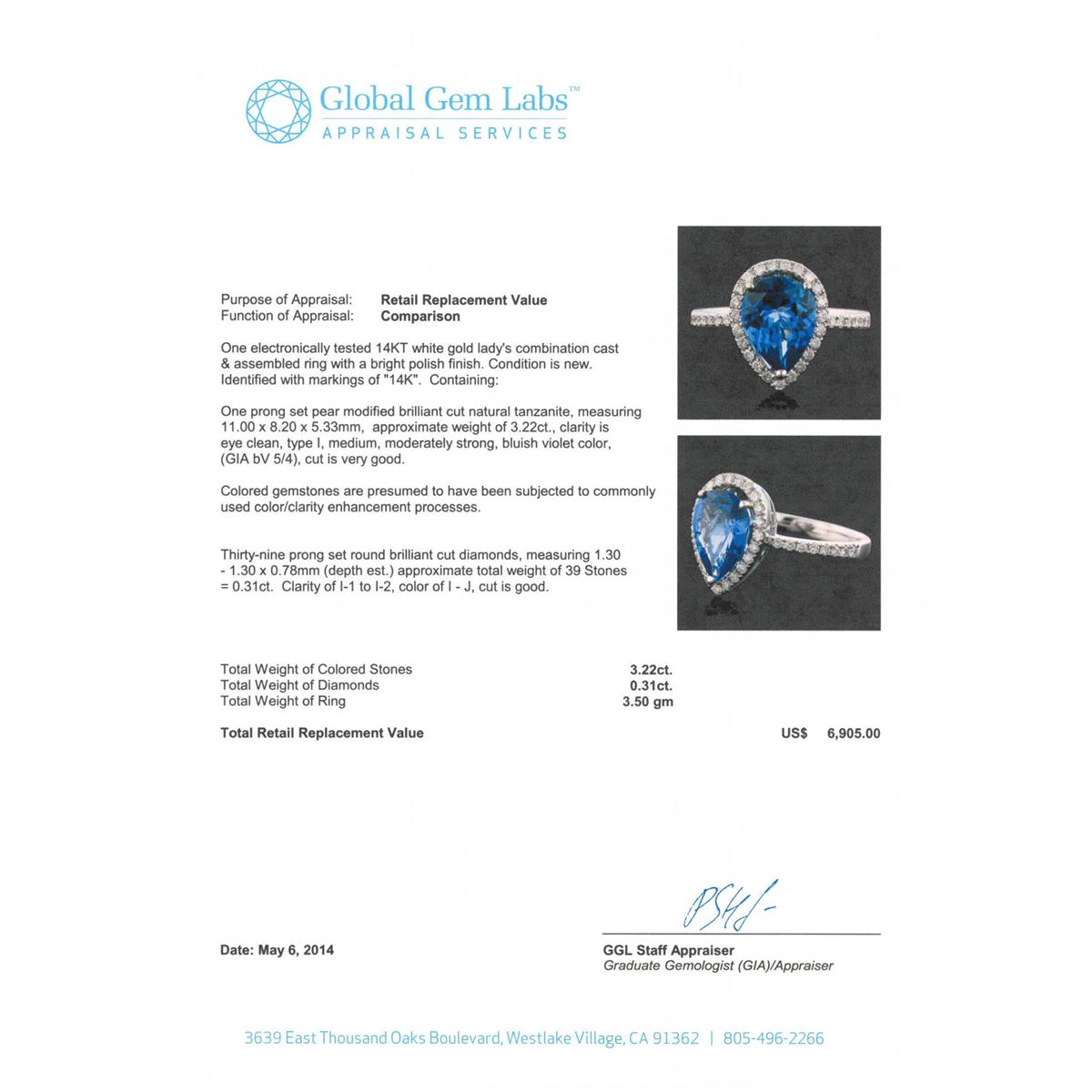 One electronically tested 14KT white gold Ladies combination cast & assembled ring with a bright polish finish. Condition is new. Identified with markings of "14K". Containing: One prong set pear modified brilliant cut natural tanzanite, measuring 11.00 x 8.20 x 5.33mm, approximate weight of 3.22ct., clarity is eye clean, type I, medium, moderately strong, bluish violet color, (GIA bV 5/4), cut is very good. Colored gemstones are presumed to have been subjected to commonly used color/clarity enhancement processes. Thirty-Nine prong set round brilliant cut diamonds, measuring 1.30 - 1.30 x 0.78mm (depth est.) approximate. Total Weight of 39 Stones = 0.31ct. . Clarity: I-1 to I-2. Color: I - J, Cut is Good. Total Weight of Colored Stones 3.22ct. Total Weight of Diamonds 0.31ct. Total Weight of Ring 3.50 grams. GGL Appraised at $6,905.00.