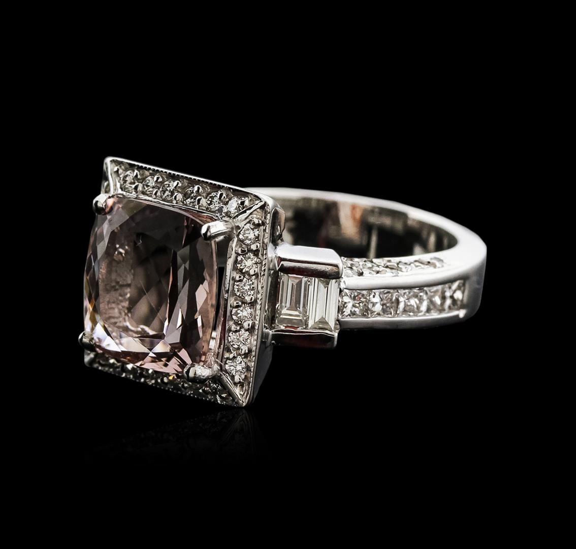 One electronically tested 14KT white gold ladies cast morganite and diamond ring with a flat shank with a bright polish finish. Identified with markings of "14K". Condition is new. Containing: One prong set square cushion modified brilliant cut natural morganite, measuring 9.68 x 9.67 x 5.40mm, approximate weight of 3.23ct., clarity is eye clean, type I, light, very slightly brownish, reddish orange color, (GIA rO 3/3), cut is good. Ten channel set princess cut diamonds, measuring 1.50 x 1.50 x 1.13mm (depth est.) approximate total weight of 10 Stones = 0.21ct. Clarity: VS-2 to SI-1. Color: I - J, Cut is Good. Four prong set baguette cut diamonds, measuring 3.00 x 1.80 x 1.53mm (depth est.) approximate total weight of 4 Stones = 0.30ct. Clarity: VS-2. Color: H - I, Cut is Good. Fifty-Seven prong set round brilliant cut diamonds, measuring 1.30 - 1.30 x 0.78mm (depth est.) approximate total weight of 57 Stones = 0.46ct. Clarity: SI-1. Color: H - I, Cut is Good. All diamonds and colored gemstones are graded in the mounting, unless otherwise stated. Colored gemstones are presumed to have been subjected to commonly used enhancement processes. Total Weight of Colored Stones 3.23ct. Total Weight of Diamonds 0.97ct. Total Weight of Ring 8.60 grams. GGL Appraised at $4,655.00.