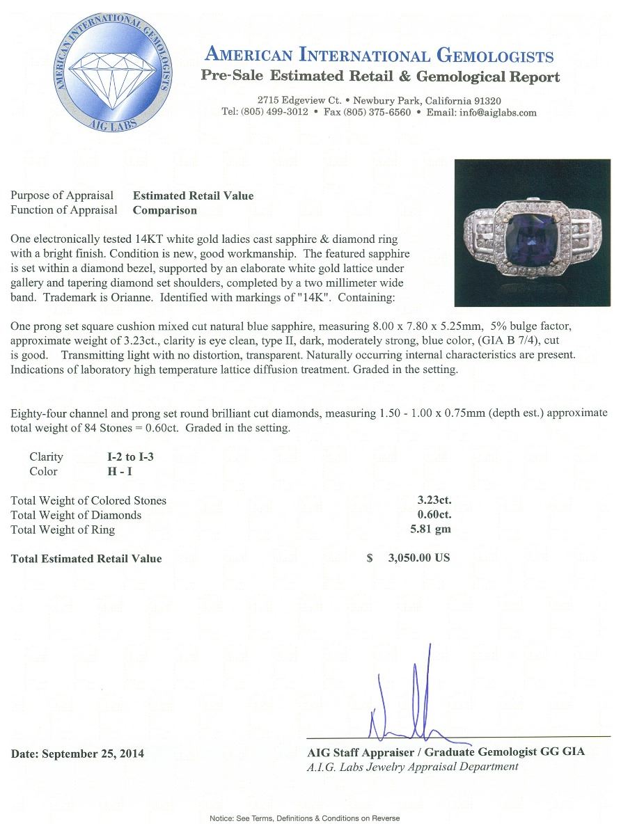 One electronically tested 14KT white gold ladies cast sapphire & diamond ring with a bright finish. The featured sapphire is set within a diamond bezel, supported by an elaborate white gold lattice under gallery and tapering diamond set shoulders, completed by a two millimeter wide band. Trademark is Orianne. Identified with markings of "14K". Condition is new, good workmanship. Containing: One prong set square cushion mixed cut natural blue sapphire, measuring 8.00 x 7.80 x 5.25mm, 5% bulge factor, approximate weight of 3.23ct., clarity is eye clean, type II, dark, moderately strong, blue color, (GIA B 7/4), cut is good. Transmitting light with no distortion, transparent. Naturally occurring internal characteristics are present. Indications of laboratory high temperature lattice diffusion treatment. Graded in the setting. Eighty-Four channel and prong set round brilliant cut diamonds, measuring 1.50 - 1.00 x 0.75mm (depth est.) approximate total weight of 84 Stones = 0.60ct. Graded in the setting. Clarity: I-2 to I-3. Color: H - I. Total Weight of Colored Stones 3.23ct. Total Weight of Diamonds 0.60ct. Total Weight of Ring 5.81 grams. AIG Appraised at $3,050.00.