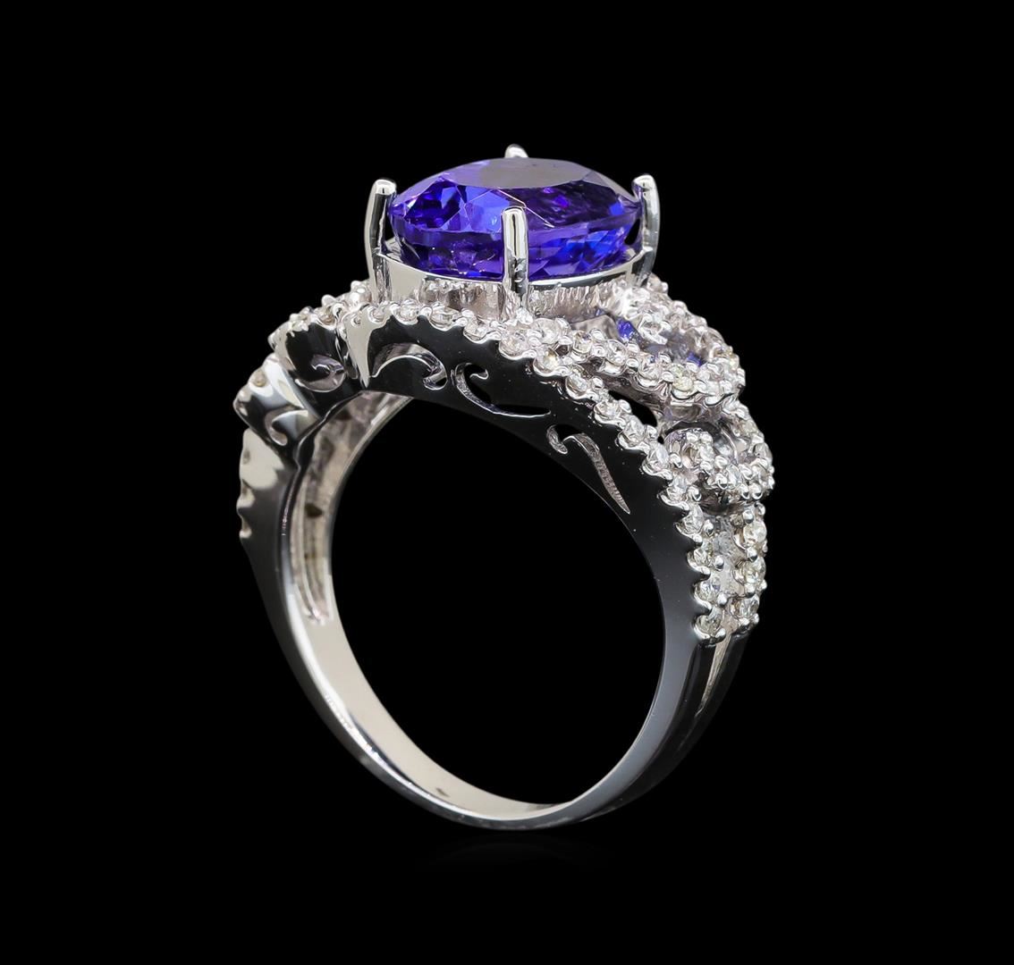 One electronically tested 14KT white gold ladies cast tanzanite and diamond ring with a bright polish finish. Identified with markings of "14K". Condition is new. Containing: One prong set oval modified brilliant cut natural tanzanite, measuring 11.00. x 8.00. x 5.21mm, approximate weight of 3.23ct., clarity is eye clean, type I, medium light, very slightly grayish, violet color, (GIA V 4/3), cut is good. Seventy-Six prong set round brilliant cut diamonds, measuring 1.30 - 1.30 x 0.78mm (depth est.) approximate total weight of 76 Stones = 0.61ct. Clarity: I-1 to I-2. Color: I - J. All diamonds and colored gemstones are graded in the mounting, unless otherwise stated. Colored gemstones are presumed to have been subjected to commonly used enhancement processes. Total Weight of Colored Stones 3.23ct. Total Weight of Diamonds 0.61ct. Total Weight of Ring 6.10 grams. GGL Appraised at $5,375.00.
