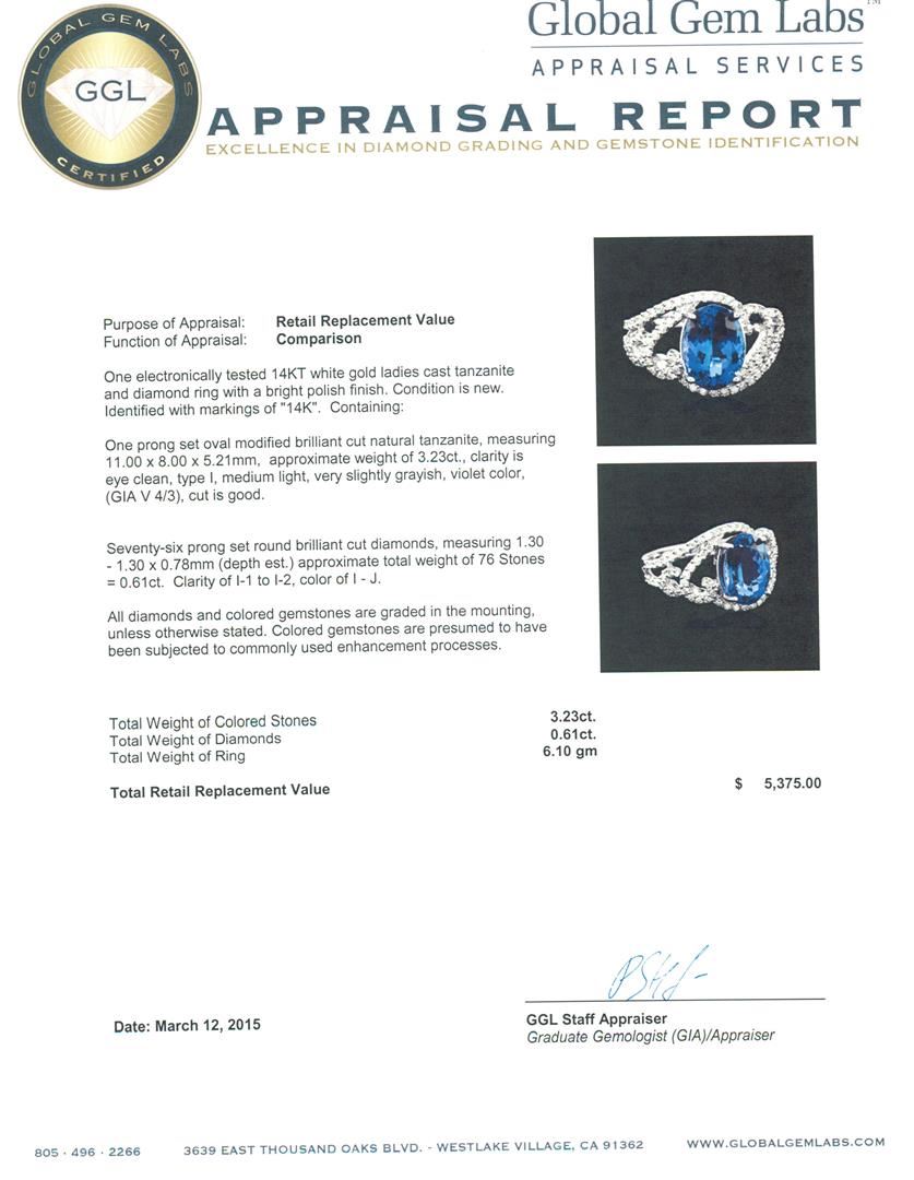 One electronically tested 14KT white gold ladies cast tanzanite and diamond ring with a bright polish finish. Identified with markings of "14K". Condition is new. Containing: One prong set oval modified brilliant cut natural tanzanite, measuring 11.00. x 8.00. x 5.21mm, approximate weight of 3.23ct., clarity is eye clean, type I, medium light, very slightly grayish, violet color, (GIA V 4/3), cut is good. Seventy-Six prong set round brilliant cut diamonds, measuring 1.30 - 1.30 x 0.78mm (depth est.) approximate total weight of 76 Stones = 0.61ct. Clarity: I-1 to I-2. Color: I - J. All diamonds and colored gemstones are graded in the mounting, unless otherwise stated. Colored gemstones are presumed to have been subjected to commonly used enhancement processes. Total Weight of Colored Stones 3.23ct. Total Weight of Diamonds 0.61ct. Total Weight of Ring 6.10 grams. GGL Appraised at $5,375.00.