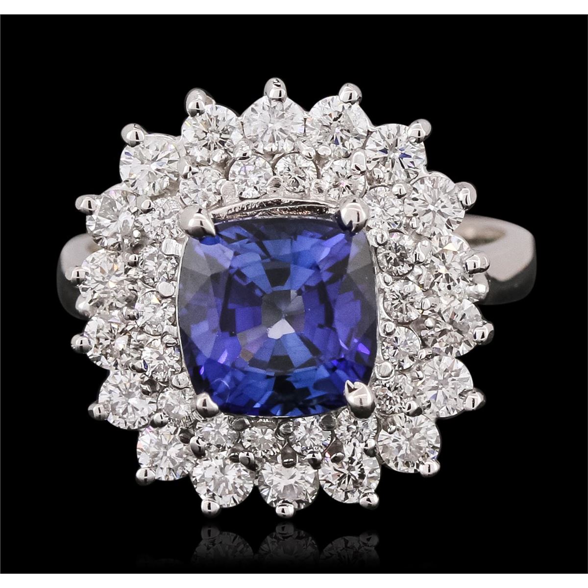 One electronically tested 14KT white gold ladies combination cast & assembled ring with a bright polish finish. Identified with markings of "K14". Condition is new. Containing: One prong set square cushion modified brilliant cut natural blue sapphire, measuring 7.90 x 7.90 x 5.50mm, approximate weight of 3.23ct., clarity is eye clean, type II, medium dark, moderately strong, blue color, (GIA B 6/4), cut is very good. Eighteen prong set round brilliant cut diamonds, measuring 2.50 - 2.50 x 1.50mm (depth est.) approximate total weight of 18 Stones = 1.03ct. Clarity: SI-1 to SI-2. Color: I - J, Cut is Good. Eighteen prong set round brilliant cut diamonds, measuring 1.50 - 1.50 x 0.90mm (depth est.) approximate total weight of 18 Stones = 0.22ct. Clarity: SI-1 to I-1. Color: I - J, Cut is Good. Colored gemstones are presumed to have been subjected to commonly used enhancement processes. All diamonds and colored gemstones are graded in the mounting, unless otherwise stated. Total Weight of Colored Stones 3.23ct. Total Weight of Diamonds 1.25ct. Total Weight of Ring 7.00 grams. GGL Appraised at $11,620.00.