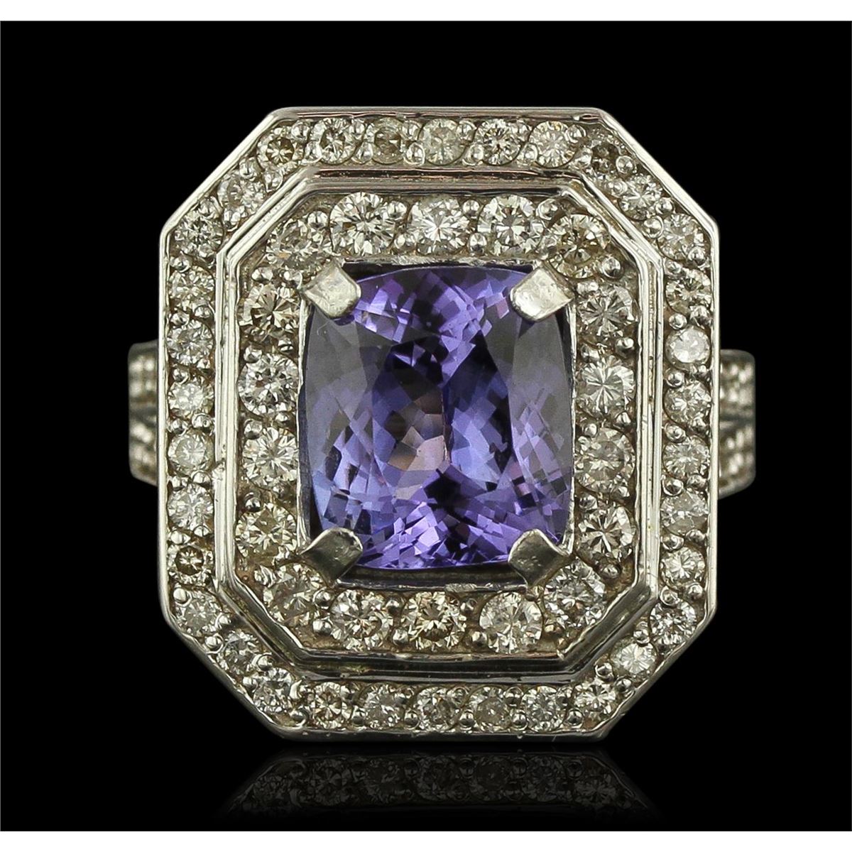One electronically tested 14KT white gold Ladies combination cast & assembled ring with a bright polish finish. Condition is new. Identified with markings of "K14". Containing: One prong set rectangular cushion modified brilliant cut natural tanzanite, measuring 9.10 x 8.19 x 5.50mm, approximate weight of 3.23ct., clarity is eye clean, type I, medium, very slightly grayish, violet color, (GIA V 5/3), cut is very good. Colored gemstones are presumed to have been subjected to commonly used color/clarity enhancement processes. Seventy-Four prong set round brilliant cut diamonds, measuring 1.50 - 1.40 x 0.48mm (depth est.) approximate. Total Weight of 74 Stones = 0.45ct. Clarity: I-1 to I-2. Color: I - J, Cut is Good. Total Weight of Colored Stones 3.23ct. Total Weight of Diamonds 0.45ct. Total Weight of Ring 11.70 grams. GGL Appraised at $9,090.00.