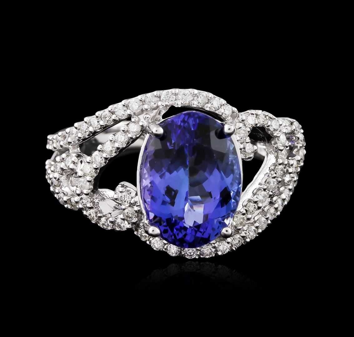 One electronically tested 14KT white gold ladies cast tanzanite and diamond ring with a bright polish finish. Identified with markings of "14K". Condition is new. Containing: One prong set oval modified brilliant cut natural tanzanite, measuring 11.00. x 8.00. x 5.21mm, approximate weight of 3.23ct., clarity is eye clean, type I, medium light, very slightly grayish, violet color, (GIA V 4/3), cut is good. Seventy-Six prong set round brilliant cut diamonds, measuring 1.30 - 1.30 x 0.78mm (depth est.) approximate total weight of 76 Stones = 0.61ct. Clarity: I-1 to I-2. Color: I - J. All diamonds and colored gemstones are graded in the mounting, unless otherwise stated. Colored gemstones are presumed to have been subjected to commonly used enhancement processes. Total Weight of Colored Stones 3.23ct. Total Weight of Diamonds 0.61ct. Total Weight of Ring 6.10 grams. GGL Appraised at $5,375.00.