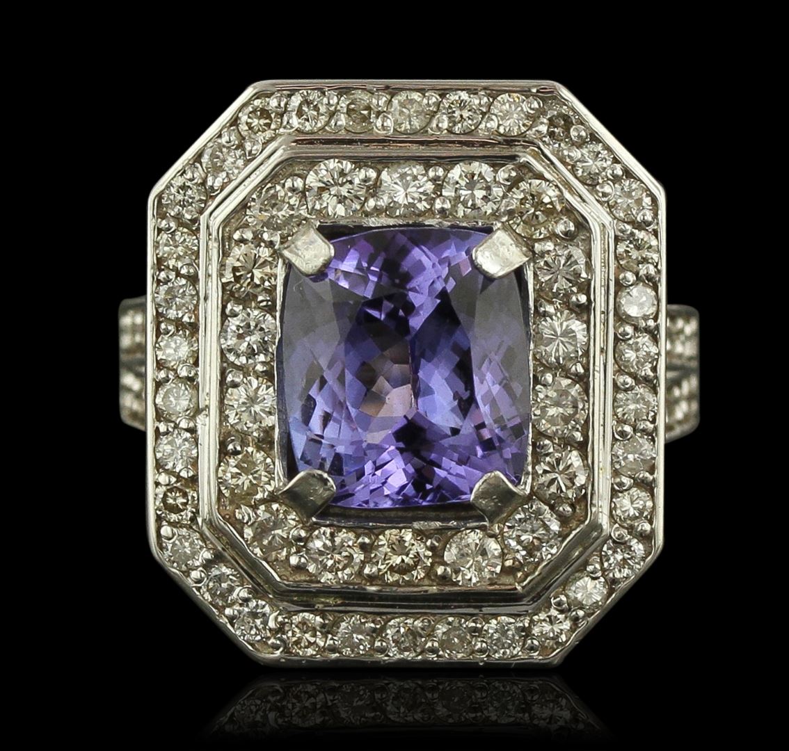 One electronically tested 14KT white gold Ladies combination cast & assembled ring with a bright polish finish. Condition is new. Identified with markings of "K14". Containing: One prong set rectangular cushion modified brilliant cut natural tanzanite, measuring 9.10 x 8.19 x 5.50mm, approximate weight of 3.23ct., clarity is eye clean, type I, medium, very slightly grayish, violet color, (GIA V 5/3), cut is very good. Colored gemstones are presumed to have been subjected to commonly used color/clarity enhancement processes. Seventy-Four prong set round brilliant cut diamonds, measuring 1.50 - 1.40 x 0.48mm (depth est.) approximate. Total Weight of 74 Stones = 0.45ct. Clarity: I-1 to I-2. Color: I - J, Cut is Good. Total Weight of Colored Stones 3.23ct. Total Weight of Diamonds 0.45ct. Total Weight of Ring 11.70 grams. GGL Appraised at $9,090.00.
