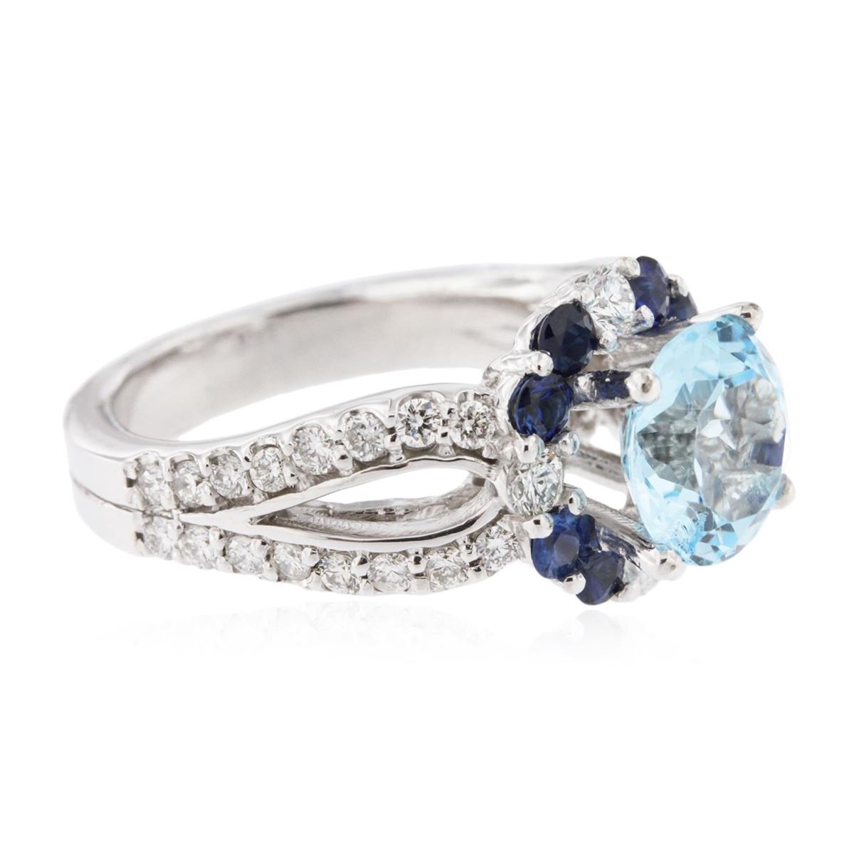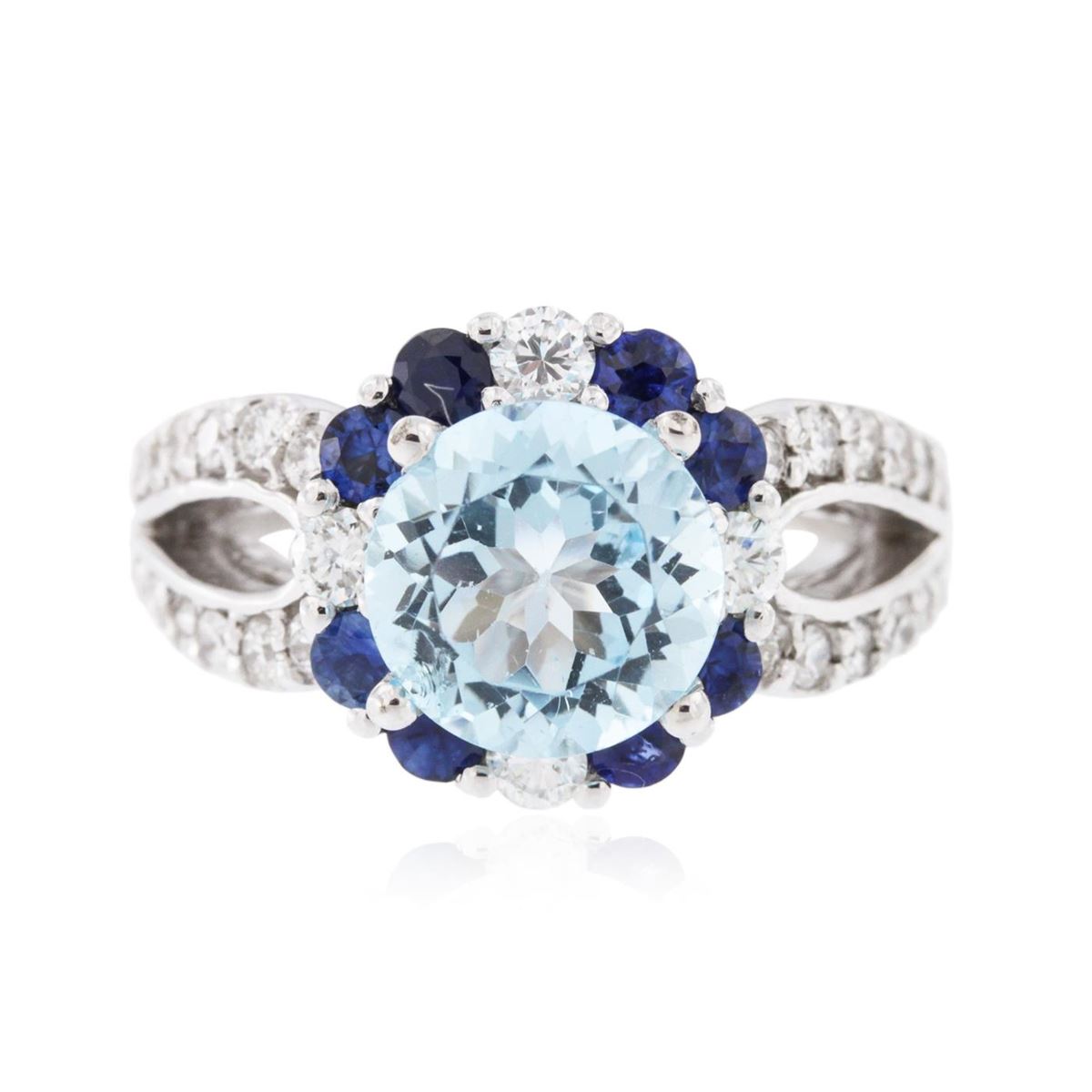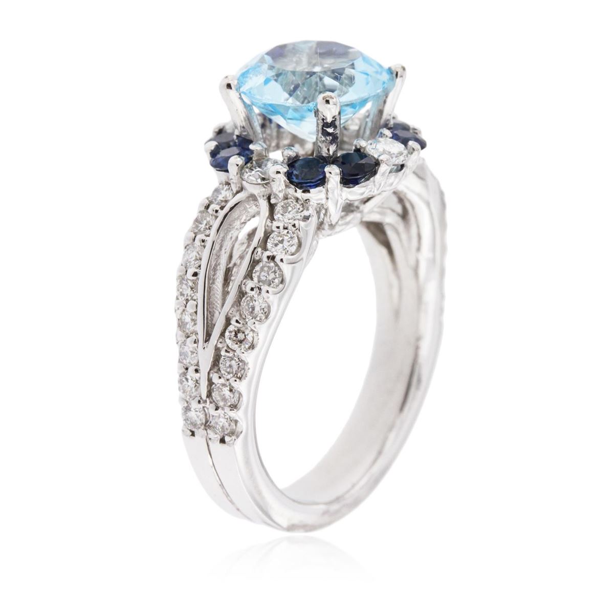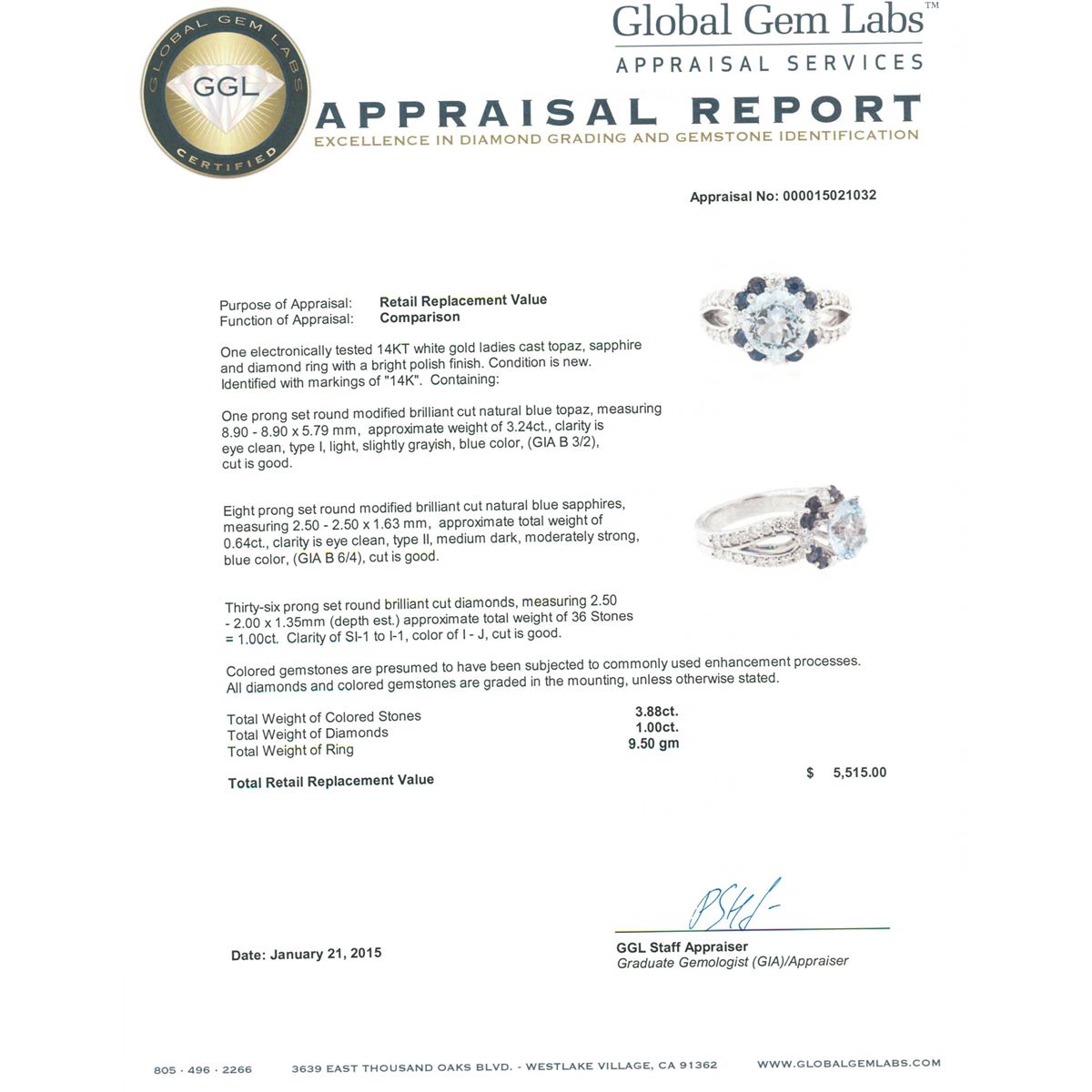 One electronically tested 14KT white gold ladies cast topaz, sapphire and diamond ring with a bright polish finish. Identified with markings of "14K". Condition is new. Containing: One prong set round modified brilliant cut natural blue topaz, measuring 8.90 - 8.90 x 5.79 mm, approximate weight of 3.24ct., clarity is eye clean, type I, light, slightly grayish, blue color, (GIA B 3/2), cut is good. Eight prong set round modified brilliant cut natural blue sapphires, measuring 2.50 - 2.50 x 1.63 mm, approximate total weight of 0.64ct., clarity is eye clean, type II, medium dark, moderately strong, blue color, (GIA B 6/4), cut is good. Thirty-Six prong set round brilliant cut diamonds, measuring 2.50 - 2.00 x 1.35mm (depth est.) approximate total weight of 36 Stones = 1.00ct. Clarity: SI-1 to I-1. Color: I - J, Cut is Good. Colored gemstones are presumed to have been subjected to commonly used enhancement processes. All diamonds and colored gemstones are graded in the mounting, unless otherwise stated. Total Weight of Colored Stones 3.88ct. Total Weight of Diamonds 1.00ct. Total Weight of Ring 9.50 grams. GGL Appraised at $5,515.00.
