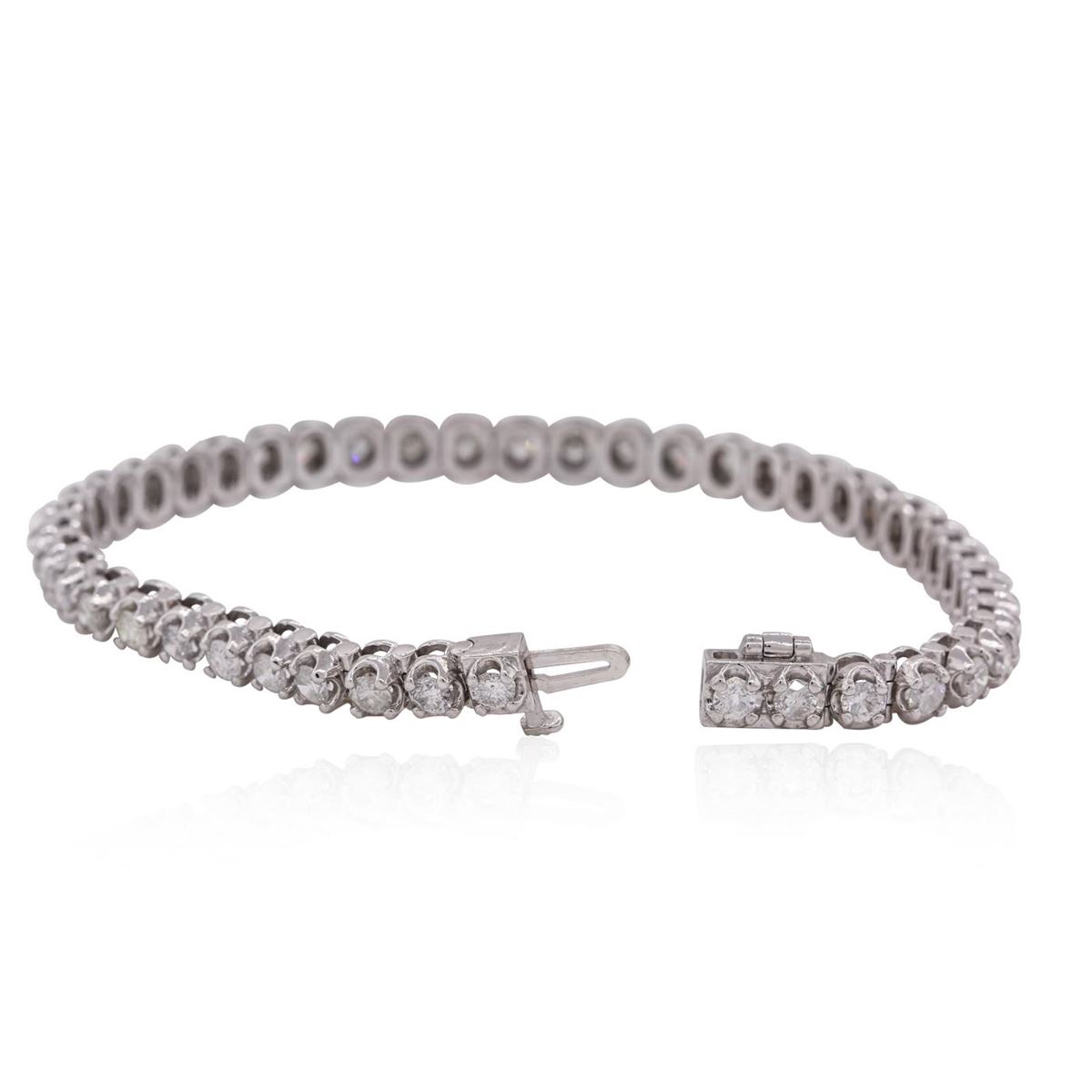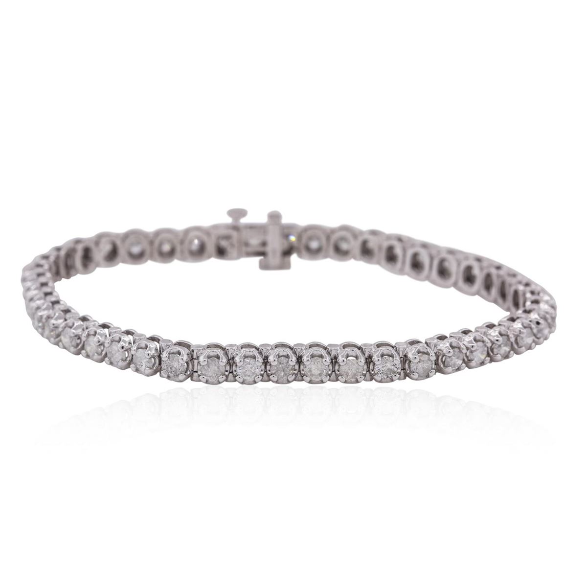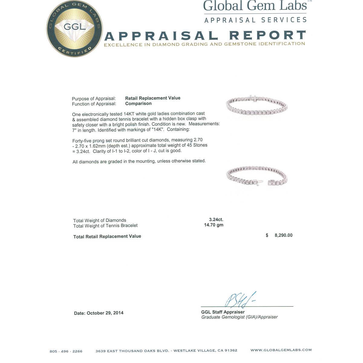 One electronically tested 14KT white gold ladies combination cast & assembled diamond tennis bracelet with a hidden box clasp with safety closer with a bright polish finish. Measurements: 7 in length. Identified with markings of 14K. Condition is new. Containing: Forty-Five prong set round brilliant cut diamonds, measuring 2.70 - 2.70 x 1.62mm (depth est.) approximate total weight of 45 Stones = 3.24ct. Clarity: I-1 to I-2. Color: I - J, Cut is Good. All diamonds are graded in the mounting, unless otherwise stated. Total Weight of Diamonds 3.24ct. Total Weight of Tennis Bracelet 14.70 grams. GGL Appraised at $8,290.00.
