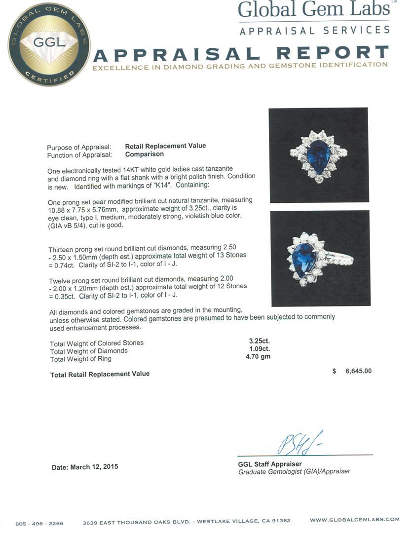 One electronically tested 14KT white gold ladies cast tanzanite and diamond ring with a flat shank with a bright polish finish. Identified with markings of "K14". Condition is new. Containing: One prong set pear modified brilliant cut natural tanzanite, measuring 10.88 x 7.75 x 5.76mm, approximate weight of 3.25ct., clarity is eye clean, type I, medium, moderately strong, violetish blue color, (GIA vB 5/4), cut is good. Thirteen prong set round brilliant cut diamonds, measuring 2.50 - 2.50 x 1.50mm (depth est.) approximate total weight of 13 Stones = 0.74ct. Clarity: SI-2 to I-1. Color: I - J. Twelve prong set round brilliant cut diamonds, measuring 2.00 - 2.00 x 1.20mm (depth est.) approximate total weight of 12 Stones = 0.35ct. Clarity: SI-2 to I-1. Color: I - J. All diamonds and colored gemstones are graded in the mounting, unless otherwise stated. Colored gemstones are presumed to have been subjected to commonly used enhancement processes. Total Weight of Colored Stones 3.25ct. Total Weight of Diamonds 1.09ct. Total Weight of Ring 4.70 grams. GGL Appraised at $6,645.00.
