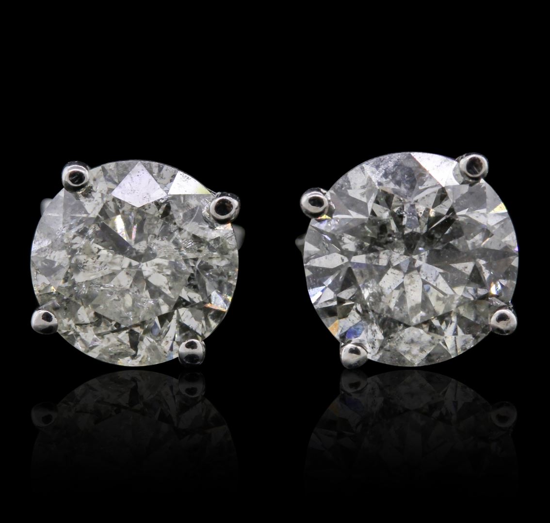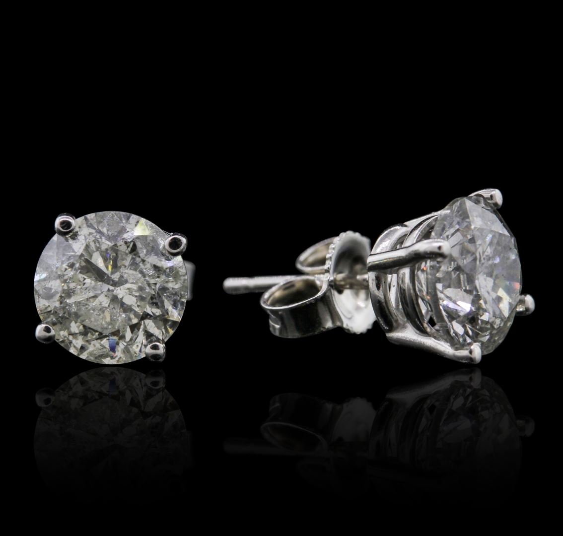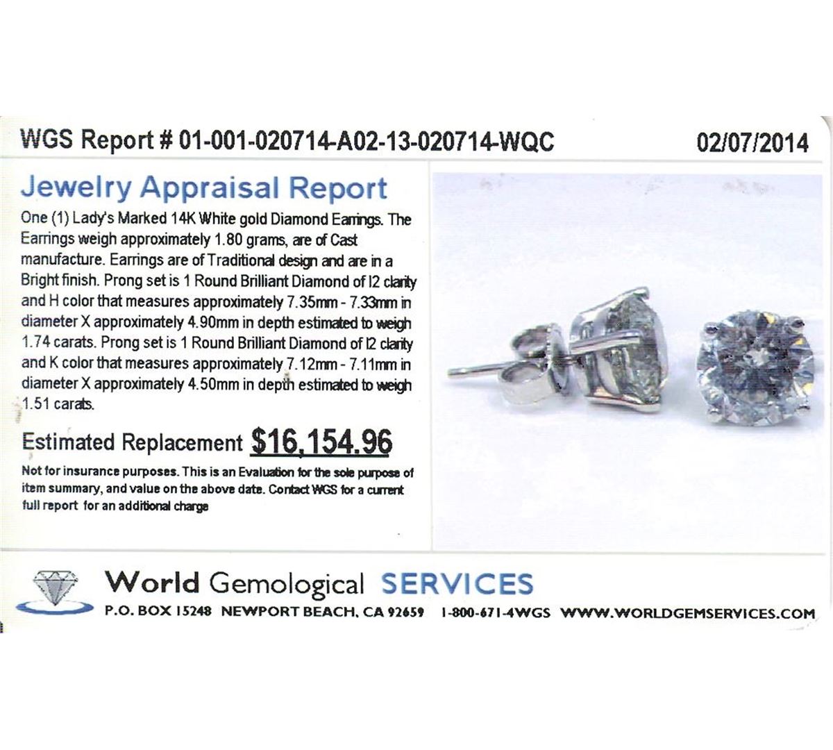 One (1) Ladies Marked 14KT White Gold Diamond Earrings. The Earrings weigh approximately 1.80 grams, are of Cast manufacture. Earrings are of Traditional design and are in a Bright finish. Prong set is 1 Round Brilliant Diamond of I2 clarity and H color that measures approximately 7.35mm-7.33mm in diameter X approximately 4.90mm in depth estimated to weigh 1.74 carats. Prong set is 1 Round Brilliant Diamond of I2 clarity and K color that measures approximately 7.12mm-7.11mm in diameter X approximately 4.50mm in depth estimated to weigh 1.51 carats. WGS Appraised at $16,154.96.