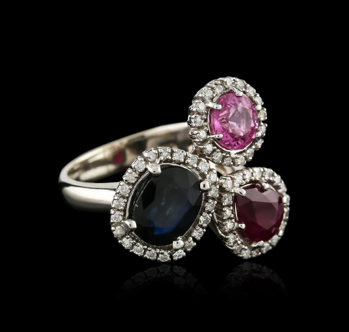 One electronically tested 14KT white gold ladies cast ruby, sapphire and diamond ring with a split shoulder shank with a bright polish finish. Identified with markings of "K14". Condition is new. Containing: One prong set pear modified brilliant cut natur GGL Appraised at $5,795.00.