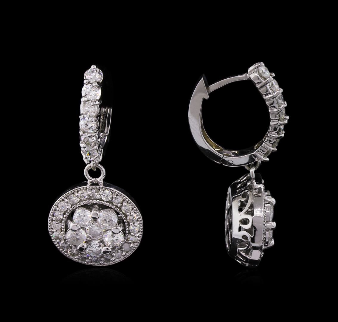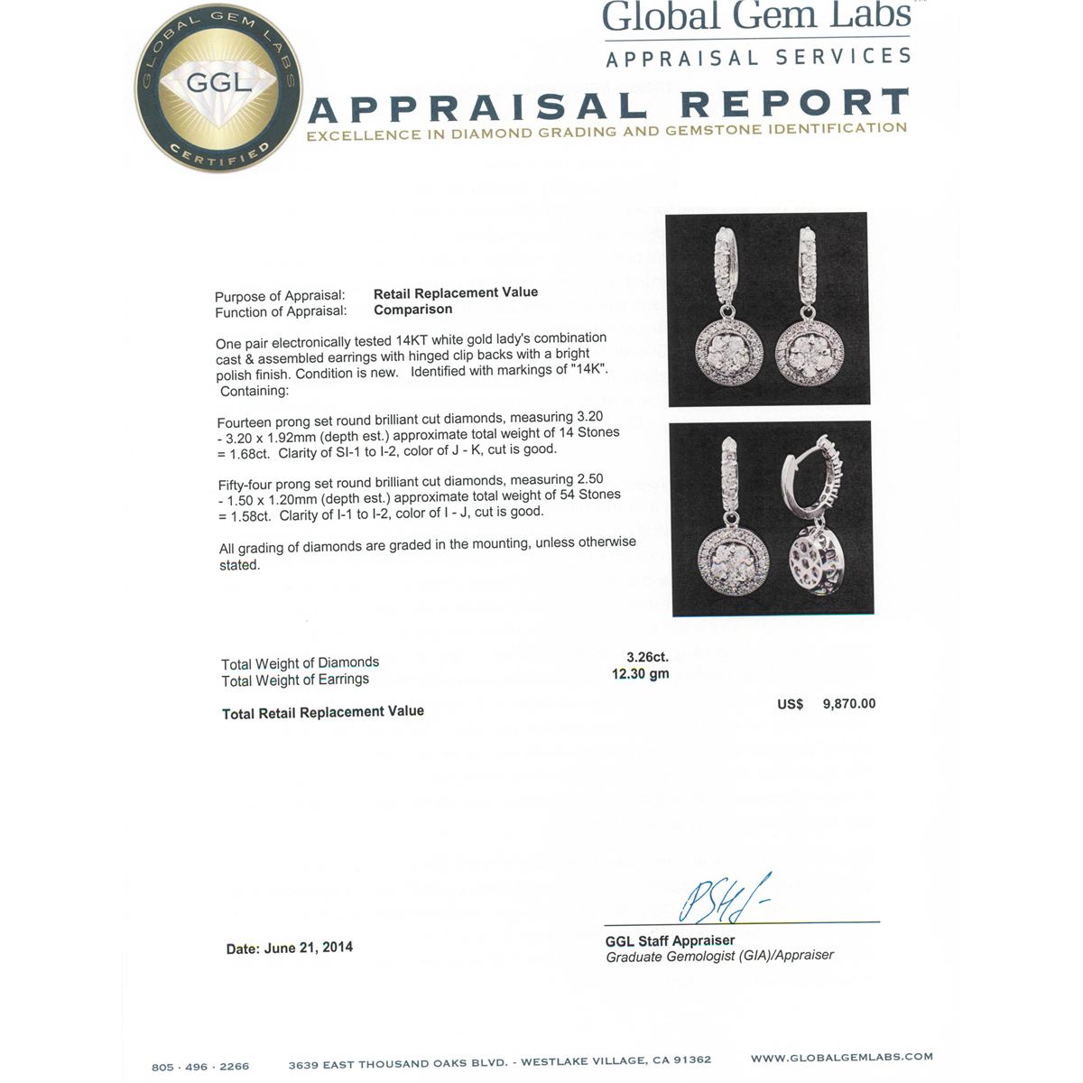 One pair electronically tested 14KT white gold Ladies combination cast & assembled earrings with hinged clip backs with a bright polish finish. Condition is new. Identified with markings of "14K". Containing: Fourteen prong set round brilliant cut diamonds, measuring 3.20 - 3.20 x 1.92mm (depth est.) approximate. Total Weight of 14 Stones = 1.68ct. Clarity: SI-1 to I-2. Color: J - K, Cut is Good. Fifty-Four prong set round brilliant cut diamonds, measuring 2.50 - 1.50 x 1.20mm (depth est.) approximate. Total Weight of 54 Stones = 1.58ct. Clarity: I-1 to I-2. Color: I - J, Cut is Good. All grading of diamonds and colored gemstones in this piece of jewelry are graded in the mounting, unless otherwise stated. Total Weight of Diamonds 3.26ct. Total Weight of Earrings 12.30 grams. GGL Appraised at $9,870.00.